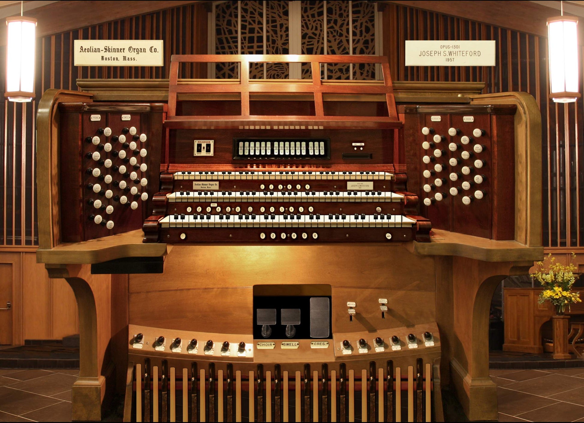 Die Aeolian-Skinner-Orgel, Opus 1301, wurde 1956-1957 hergestellt, als der tonale Direktor des Unternehmens Joseph S. Whiteford war, der Nachfolger des verstorbenen G. Donald Harrison. Die Orgel ist immer noch im "American Classic"-Stil von Harrison verwurzelt, obwohl Opus 1301 Zeugnis von Harrisons späteren Interessen ablegt, als er mit modernen Versionen alter deutscher Solo-Reed-Register (Krummhorn, Fagott, Rohr-Schalmei) experimentierte und sich etwas in Richtung des (neo-)barocken Designs bewegte (Hauptchoräle gekrönt mit Mixturen auf allen Manualen, ungehäusertes Pfeifenwerk). Joseph S. Whitefords tonale Prinzipien waren ähnlich den späten Visionen Harrisons, wobei er vielleicht noch mehr Wert auf die Prinzipien des barocken Orgelbaus legte (nicht geknickte Pfeifen mit ausdrucksvoller Artikulation, niedrigeren Winddrücken, intensiven Reeds).