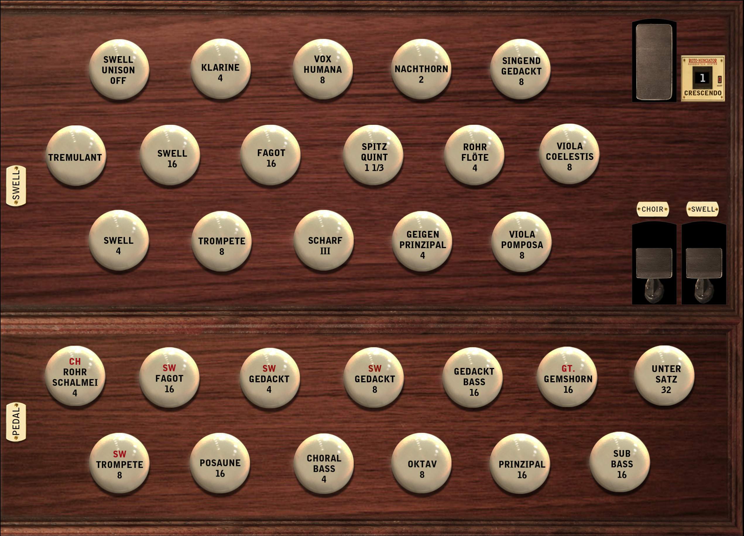 Die Schwell- und Chorabteilungen haben Tremulanten, alle Register wurden zweimal aufgenommen, mit dem Tremulanten ein- und ausgeschaltet. Somit sind authentische tremulierte Reihen im Hauptwerk-Modell des Instruments verfügbar. Crescendo-Pedal verfügbar.