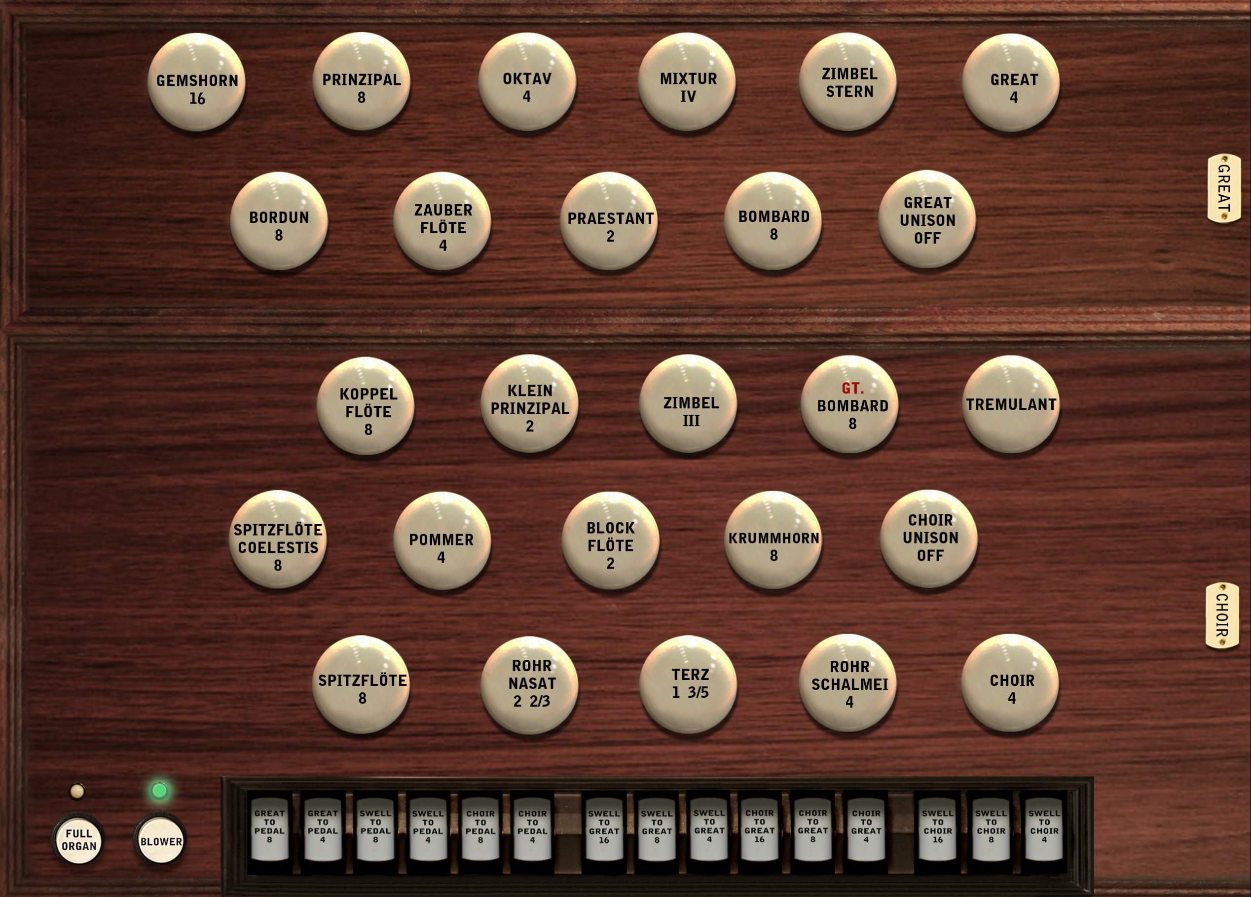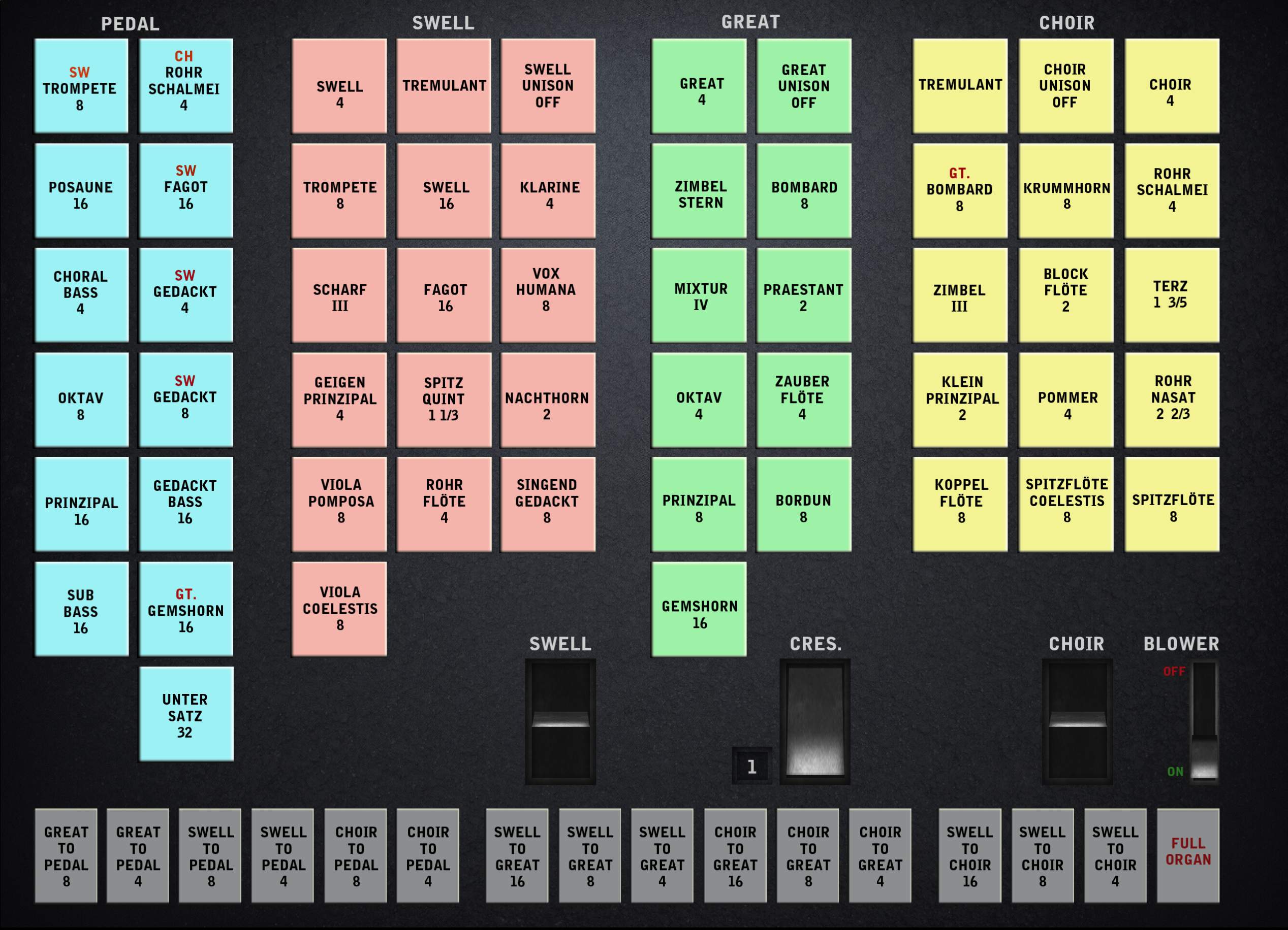 ** Der Choralbombard wird ursprünglich mit dem Großen geteilt. Für das Muster-Set ist ein weiterer Choralbombard verfügbar. Dieser eigenständige Choralbombard kann über einen speziellen Schalter im Mixer-Tab des Muster-Sets aktiviert werden. Sein Zweck ist die solistische Aufführung, er sollte niemals als Teil des Tutti (voller Orgel) verwendet werden. -