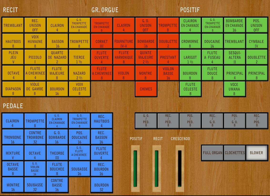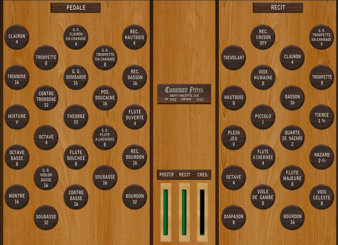 Die französischen Registerbezeichnungen auf Op. 3742 spiegeln hauptsächlich Casavants Heimat in Montréal wider (wo die Landessprache Französisch ist), aber sie deuten auch auf den gefilterten Einfluss des französischen Romantizismus hin, der Teil vieler amerikanischer eklektischer Orgeln ist. (Op. 3742 ist jedoch sicherlich keine Orgel im echten französischen romantischen Stil.)