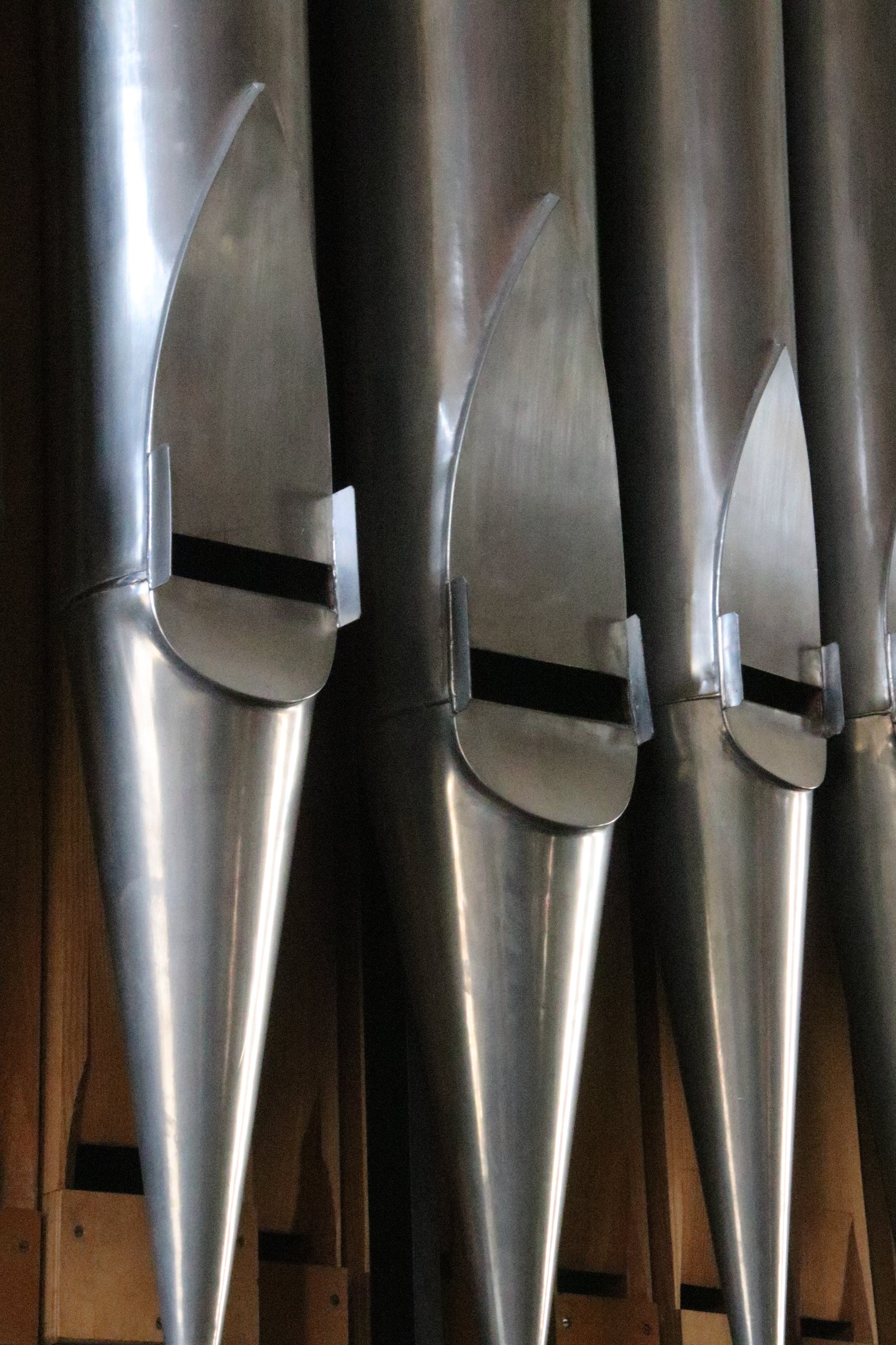 The penetrating voicing design of this organ was supported by proper scaling and first-class materials; only tin alloy and copper were used for the metal pipes (including the 16' principal). The musical intention was to give the individual divisions characteristic plenums which combine to form a magnificent overall plenum, but without restricting the richness of color. No. 5 (Nonenkornett 22/3′), for example, gives a decidedly “heavy” 16' darkening of the Great division, but is at the same time (with and without foundation) one of the most luminous solo stops of the organ. No. 8 (Gambetta 4' 22/3′), consisting of narrow-bassed Gemshorns, has the task of creating a truly homogeneous accompanying choir for the numerous c.f. mixtures of the other works, together with No. 3 (Gemshorn 8' ). No. 10 (Quarte 11/3′ 1' ) consists of two narrow ranks for the pre-plenum, but it can also be used to sharpen the the mixture, or present a “glassy” cantus firmus.