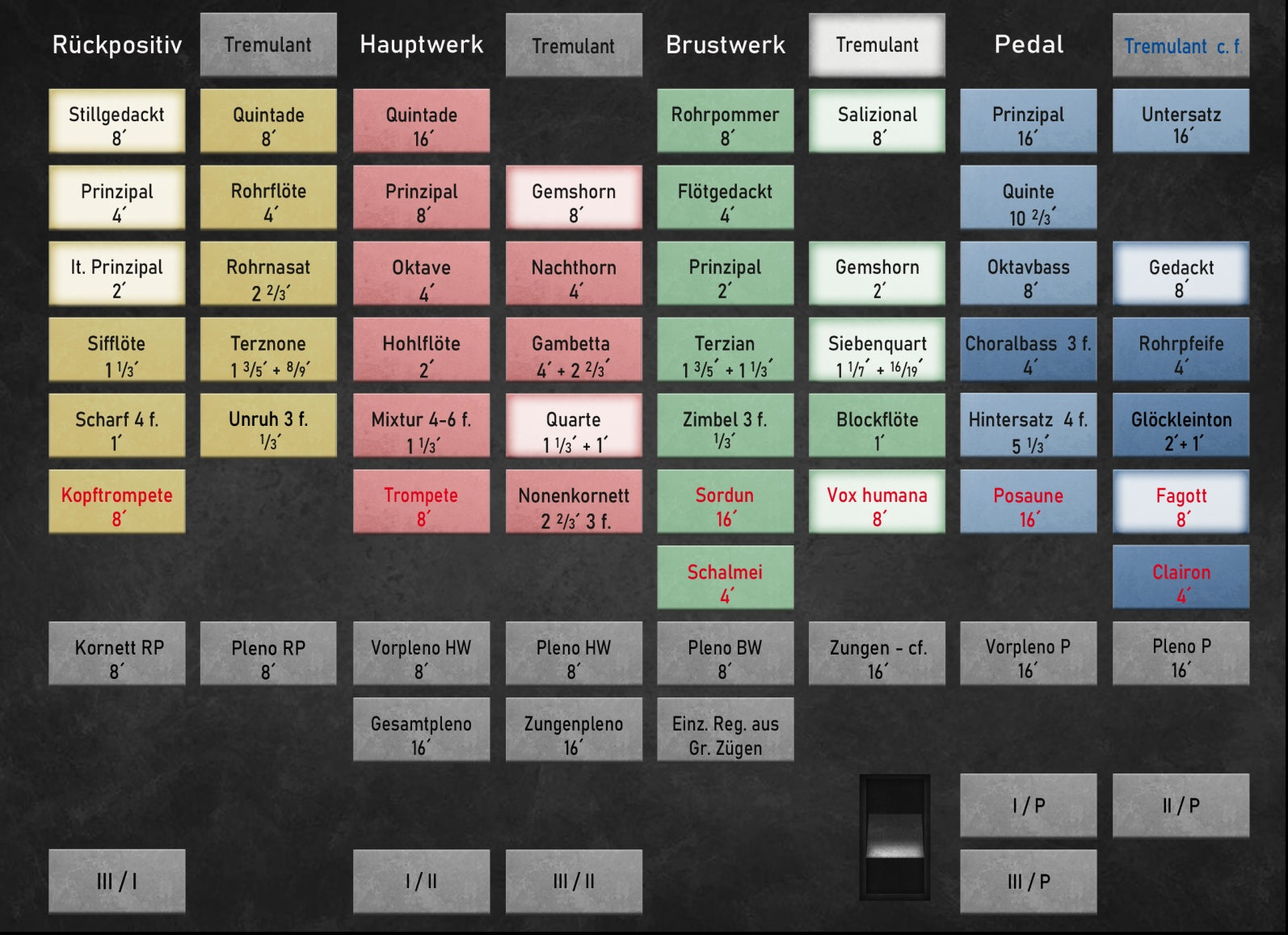 In the Pedal (in addition to sufficient c.f. possibilities), particular importance was given to a “gravity” ballancing the brightness of the manuals.