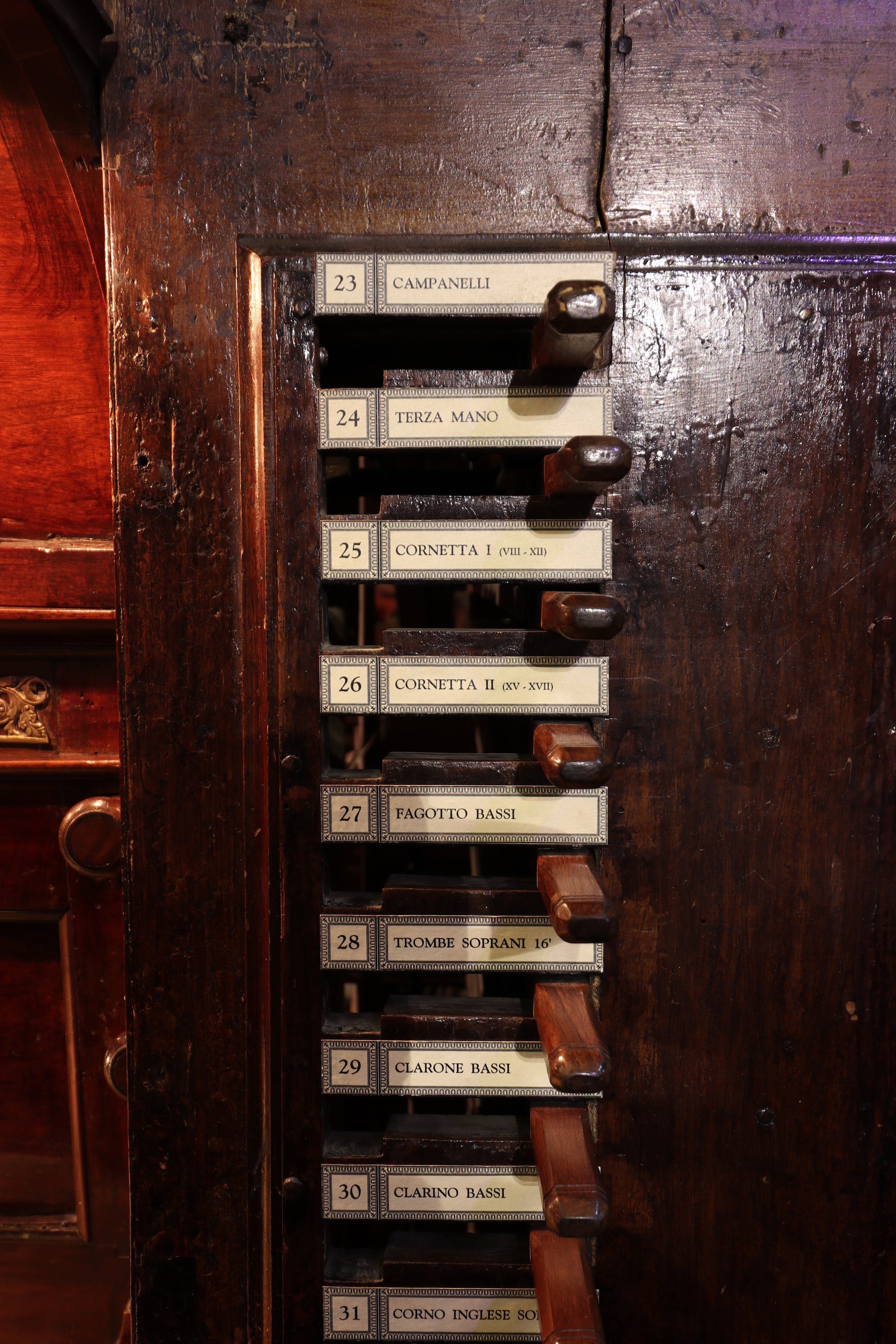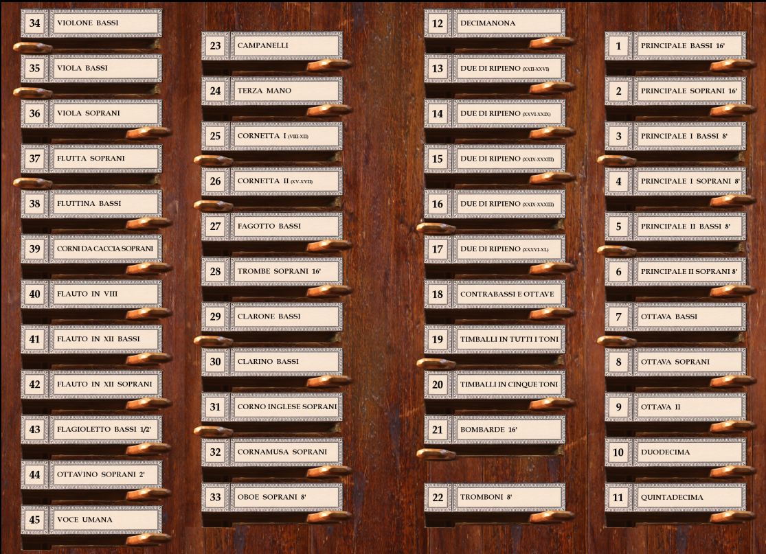 Fußschalter für einige Stops sind in Form von kleinen Latch-Down-Fußpedalen verfügbar, manchmal zusätzlich zu Ziehstopps für einige charakteristische Stops. An der echten Konsole sind diese Schalter wie folgt angeordnet (von links nach rechts): Fagotto bassi, Corno Inglese soprani, Flagioletto bassi, Cornamusa, Campane, Unione dei due Organi, Gran Cassa, Tiratutti.