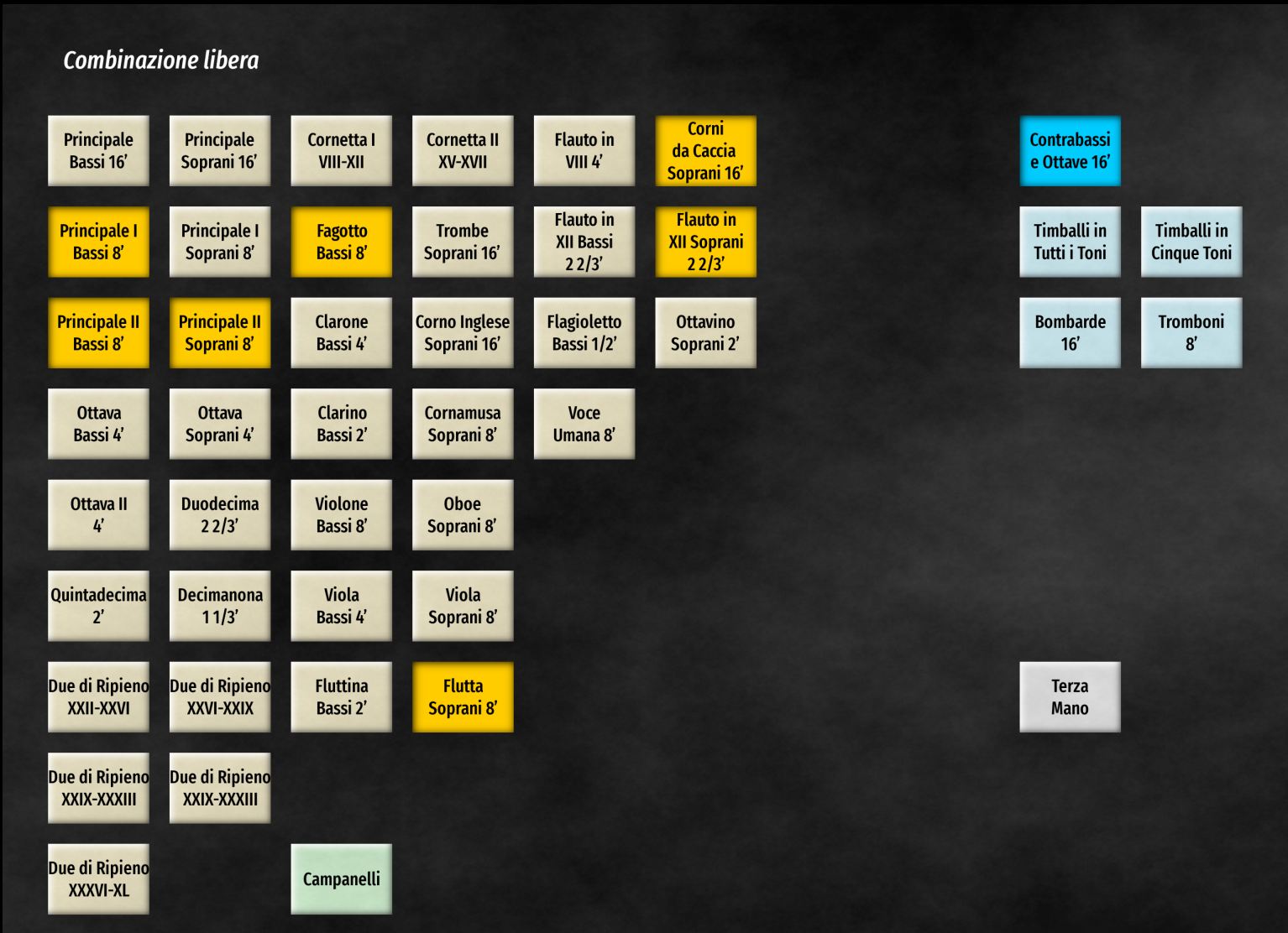 Combinazione libera alla Lombarda - eine freie Kombination. Wählen Sie die Stops auf dem speziellen Hauptwerk-Bildschirm vor und aktivieren Sie sie alle auf einmal, indem Sie die Combinazione libera-Taste drücken. (Die Aktion der Combinazione libera ist identisch mit den Hauptwerk Master Reversible Combinations.). Nur Stops des Grand'Organo dürfen für die Combinazione libera vorgewählt werden. Die Vorwahl eines bestimmten Stops ist auf den fotorealistischen Registern durch eine vertikale Leiste am linken Rand des Stoppschildes sichtbar. Diese Leiste ist sogar anklickbar, um die combinazione libera direkt von den fotorealistischen Registern in Hauptwerk zu ändern.