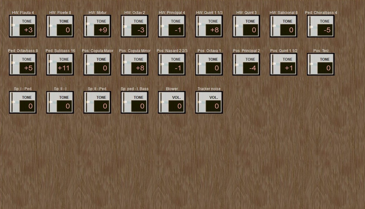 Der Bruch in der höchsten Oktave ist vielleicht etwas spekulativ, dennoch haben tschechische Orgelbauer fast immer den 1'-Rang mit einem Bruch gebaut. Wenn eine plausiblere Lösung angeboten wird, würde ich sie gerne zum Vergleich in Hauptwerk modellieren. Bei der Beschreibung unseres digitalen Modells bietet die ursprüngliche Version des ODF die Roh-Tonhöhen der Pfeifen, wie sie aufgenommen wurden, die erweiterte Version des ODF bietet die Tonhöhen, die auf die oben präsentierte Komposition geglättet wurden.
