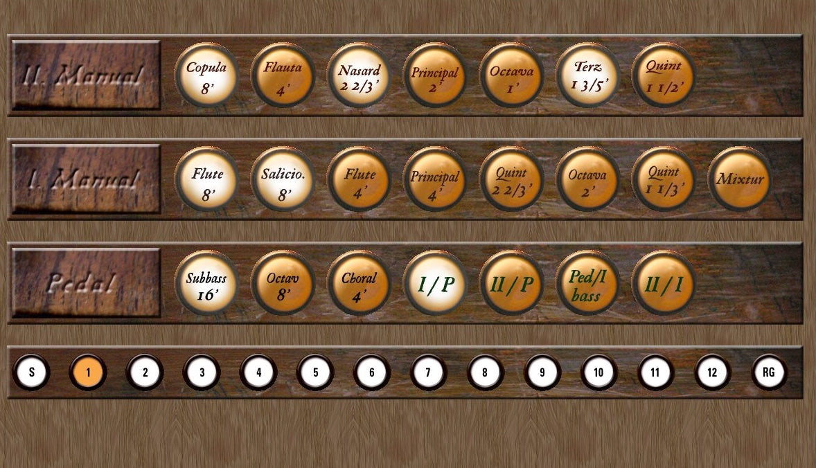 Die hier präsentierte virtuelle Orgel bietet die ursprüngliche Form des Instruments, reproduziert die kurzen Oktaven, das ursprüngliche Layout und Aussehen der Registerzüge, die begrenzte Registerliste und den Pedalumfang. Abgesehen von der Dokumentation der gegenwärtigen Situation ermöglicht dies das Studium der entsprechenden Orgelmusik unter perfekt angemessenen Bedingungen.