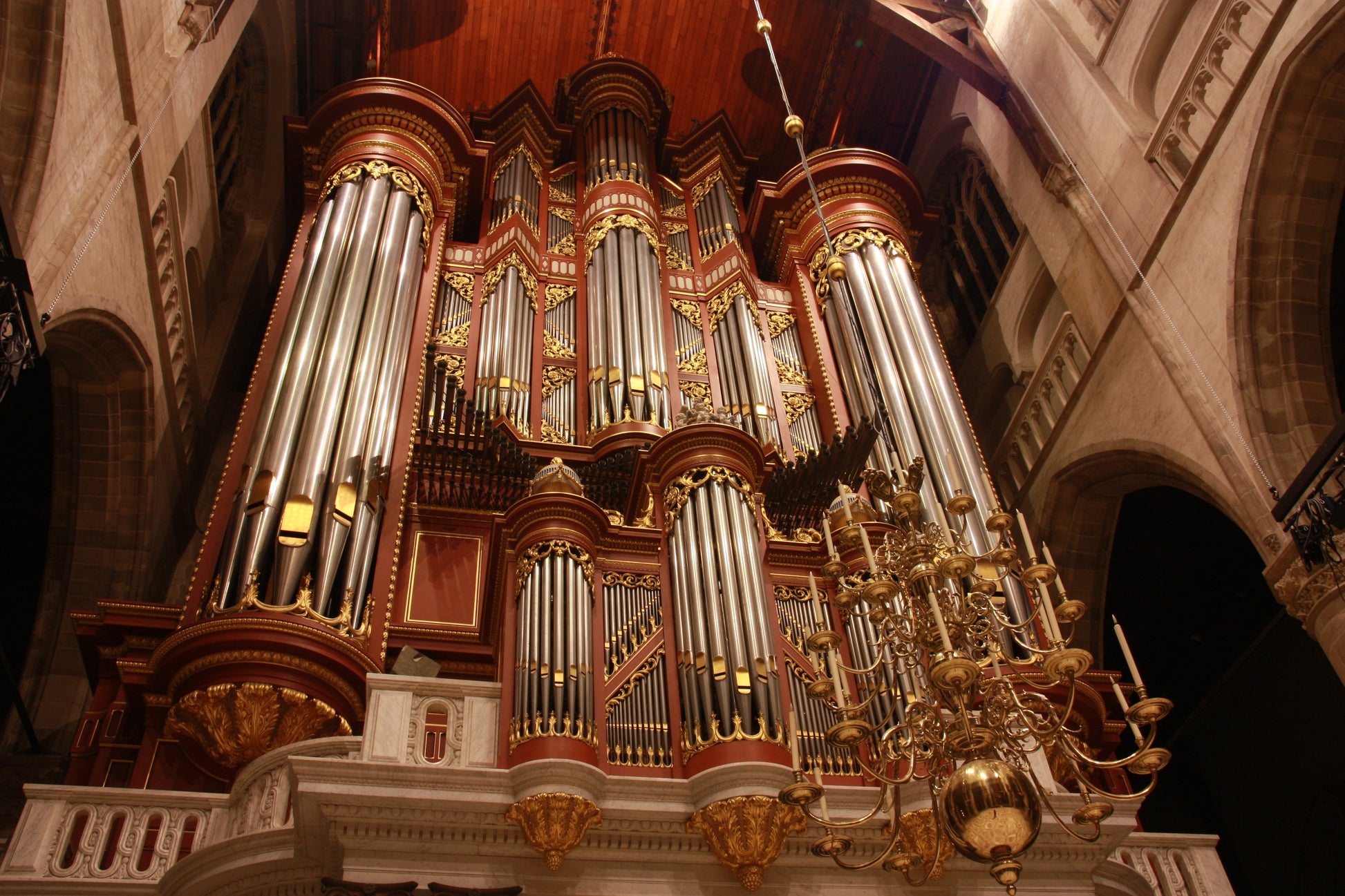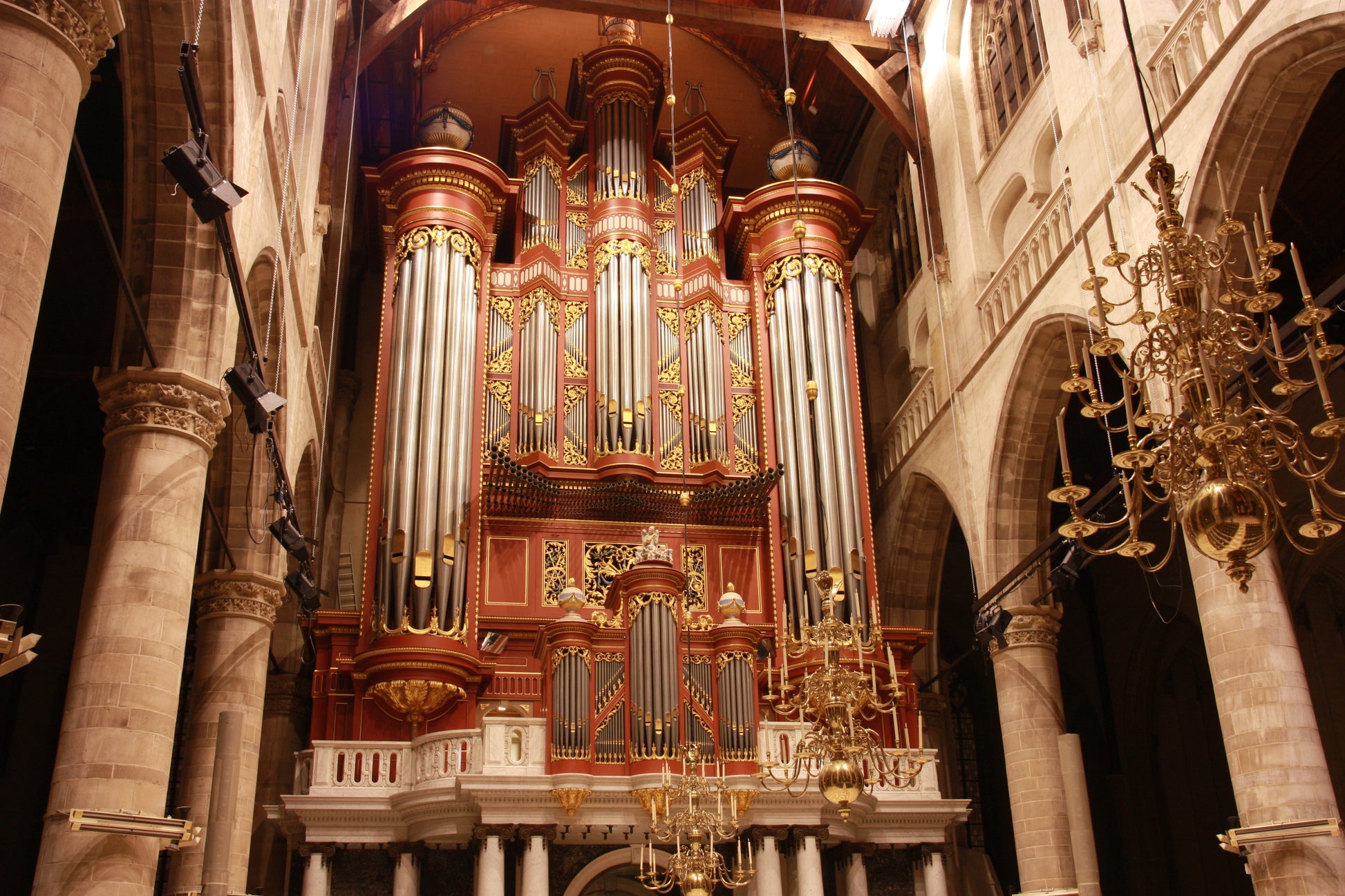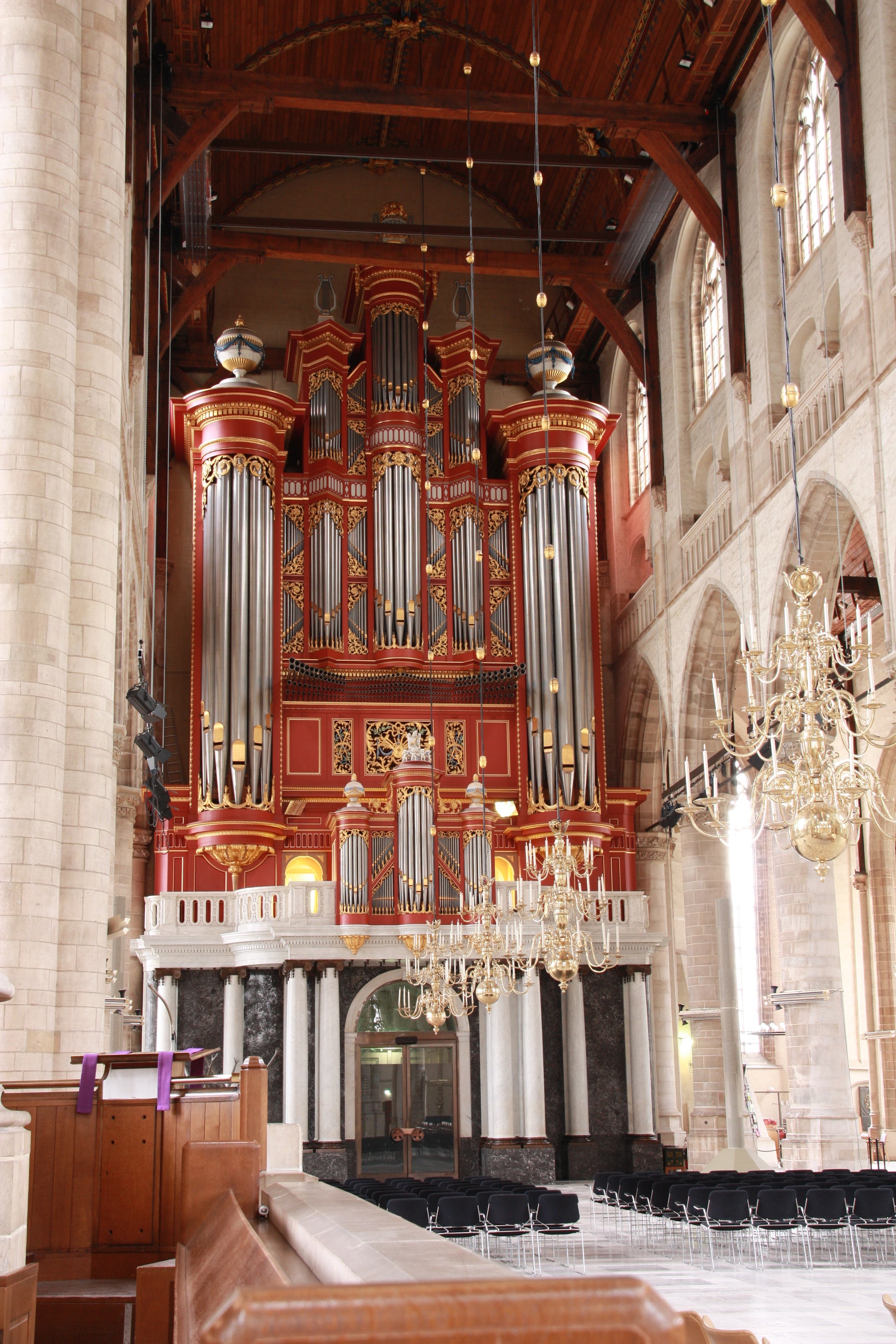 Die ursprüngliche Kirche hatte eine große 3-manualige Orgel von Hans Goltfuss aus dem Jahr 1644, aber ein neues Instrument sollte sie 1790 ersetzen. Die Arbeiten am neuen Instrument wurden erst 1828 abgeschlossen, während mehrere Orgelbauer nacheinander daran arbeiteten. 1845 vergrößerte Bätz dieses Instrument auf 72 Register. Dennoch wurde dieses Instrument während des Krieges zusammen mit der Kirche vollständig zerstört. Die große Orgel, die wir heute in der Kirche hören können, wurde 1973 von Marcussen & Son gebaut, das Orgelgehäuse wurde von dem Architekten J. W. Besemer entworfen. Das Instrument basiert auf einem 32-Fuß-Pedal und besteht aus sechs Abteilungen (Rugwerk, Hoofdwerk, Bovenwerk, Borstwerk, Chamadewerk und Pedaal). Es ist eine vollständig mechanische Orgel mit 85 klingenden Registern und ca. 7600 Pfeifen. Es wird gesagt, dass es die größte rein mechanische Orgel in Europa ist. Es gibt jedoch den Barker-Mechanismus, der optional über ein Fußpedal aktiviert werden kann, um dem Organisten zu helfen, wenn alle Manuale miteinander gekoppelt sind. Das gesamte Instrument kann jedoch auch ohne dieses Gerät sehr gut bedient werden.