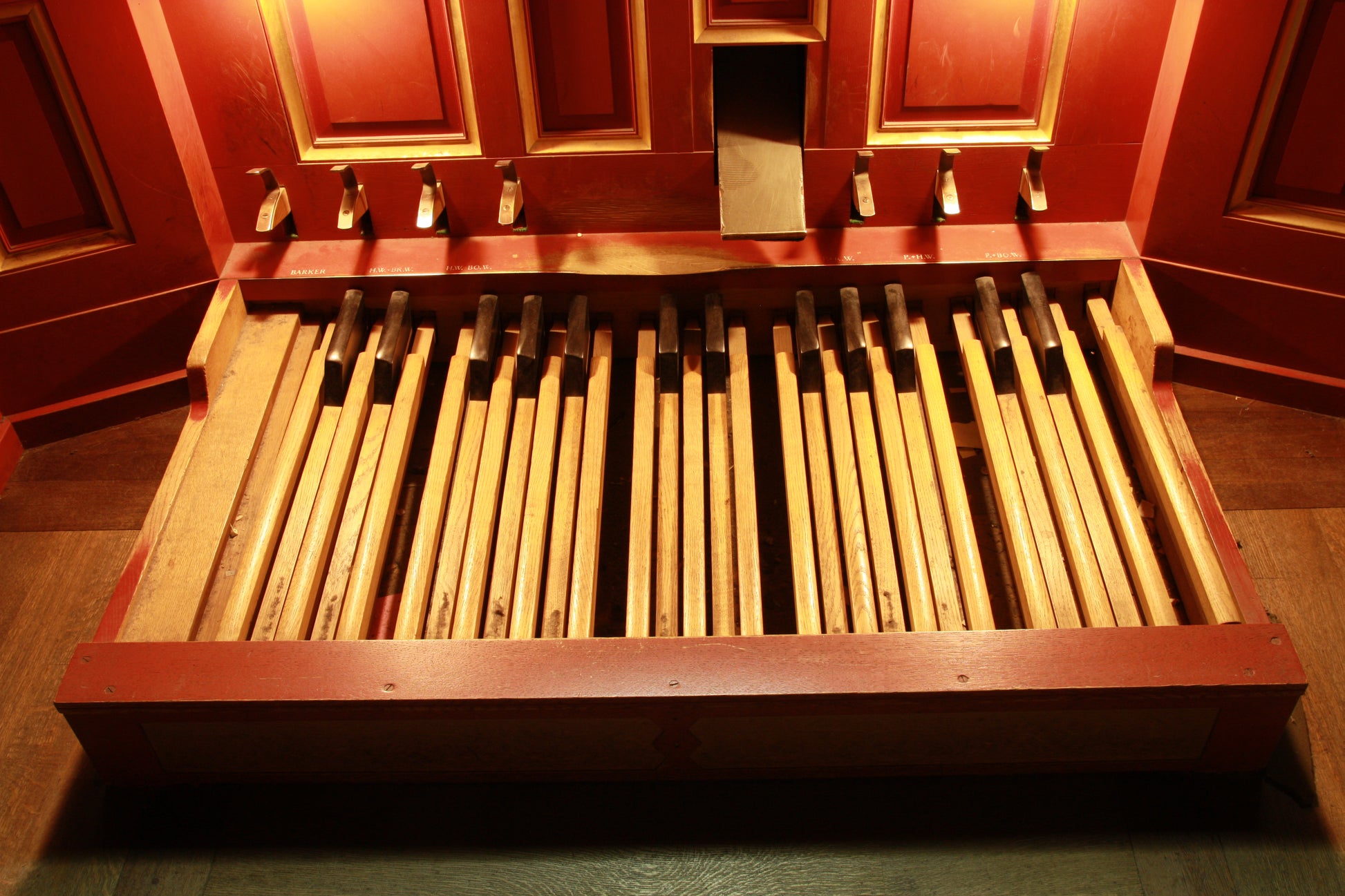 Ein spezieller Fußhebel existiert auf dem echten Instrument. Er wird "Barker" genannt. Dies ermöglicht der Barker-Maschine im II. Manual, dem Spieler zu helfen, wenn das Instrument unter voller Last und vollständig gekoppelt ist. Dies wurde nicht reproduziert, da ein solcher Mechanismus auf digitalen Konsolen nicht benötigt wird.