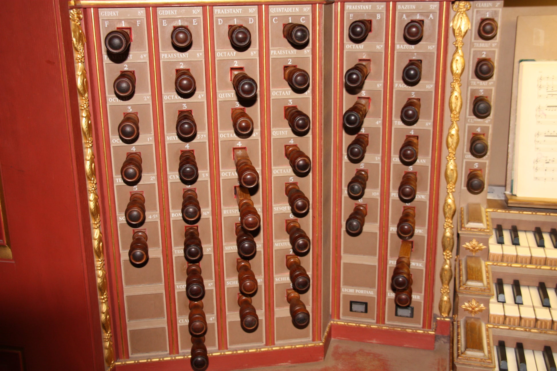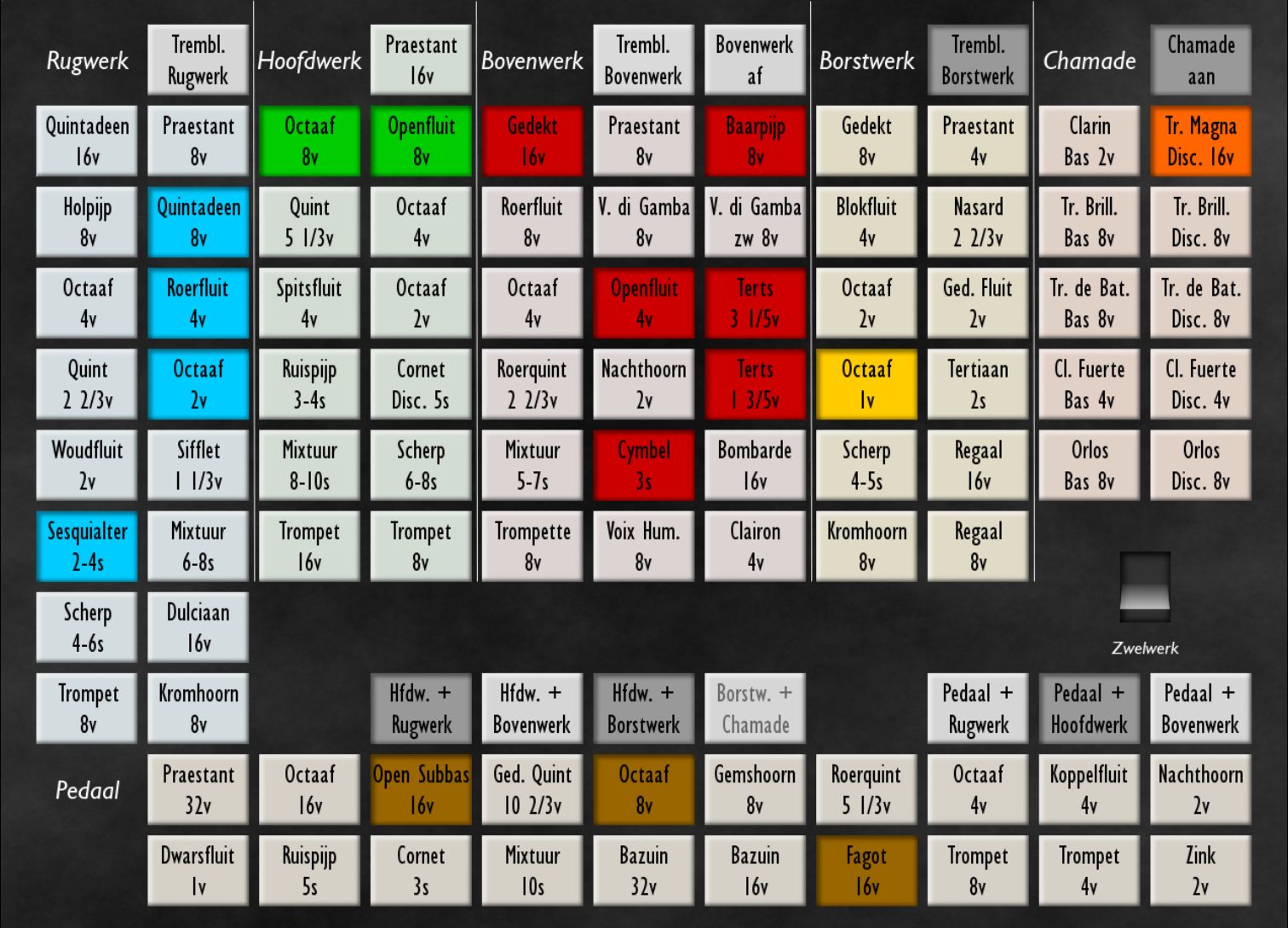 Normale Intramanual-Koppler (I - II, III - II, IV - II) verfügbar, Koppler zum Pedal (I - Ped, II - Ped, III - Ped) verfügbar. Das Bovenwerk kann durch Ziehen des Bovenwerk-Abzugsstops stummgeschaltet werden.