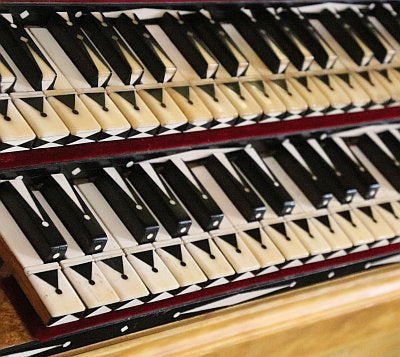 Der ursprüngliche Umfang der Tastaturen beträgt 51 Tasten, erweiterbar auf 54 Tasten über einen Mischerschalter. Der ursprüngliche Umfang der Pedalabteilung beträgt 13 diatonische Tasten.