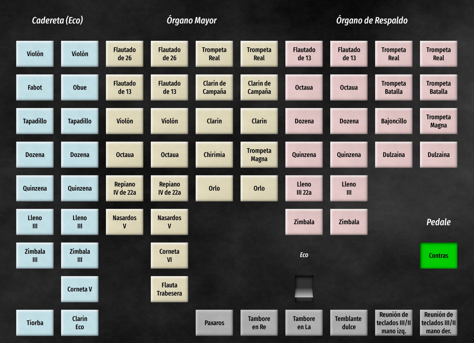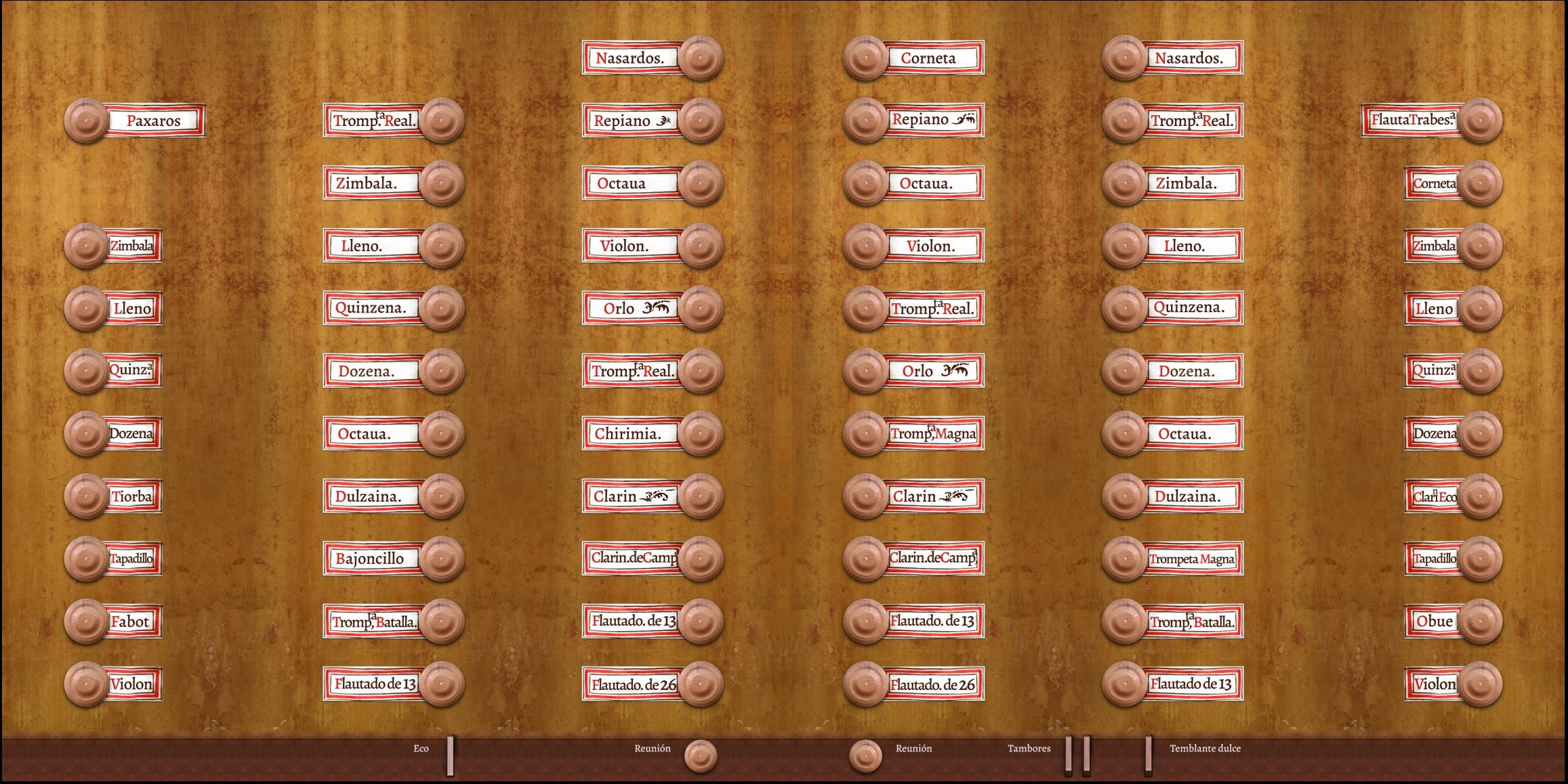 Zusätzlich zu den Organo Mayor und Organo Respaldo, die Orgel hat ein Cadereta division, die sich tief im Inneren des Gehäuses des Instruments befindet und in der Lage ist, eine andere Art von Echo zu erzeugen. Der ursprüngliche Vertrag enthält eine detaillierte Beschreibung dessen, was das CaderetaDas Design sollte so gestaltet sein, dass es angemessen auf jedes Register des Echos reagiert. Organo Mayor. Der Cadereta is enclosed in a box that can be opened via an unbalanced Pedal to the left of the pedalboard. Die Favot-Obue and the Violon of the Cadereta sind aus praktischen Gründen nicht im Originalinstrument eingeschlossen - die Pfeifen sind zu hoch, um im begrenzten Raum, der für die Box zur Verfügung steht, eingeschlossen zu werden. Wir haben uns entschieden, sie im Hauptwerk-Modell einzuschließen.