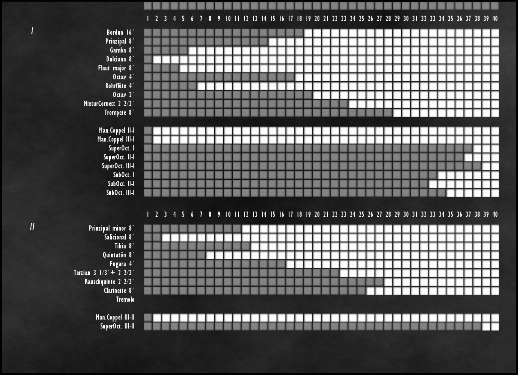 Combinaisons fixes : P, MF, F, FF, Tutti, Ausloser, Streicherchor, Zungenchor.