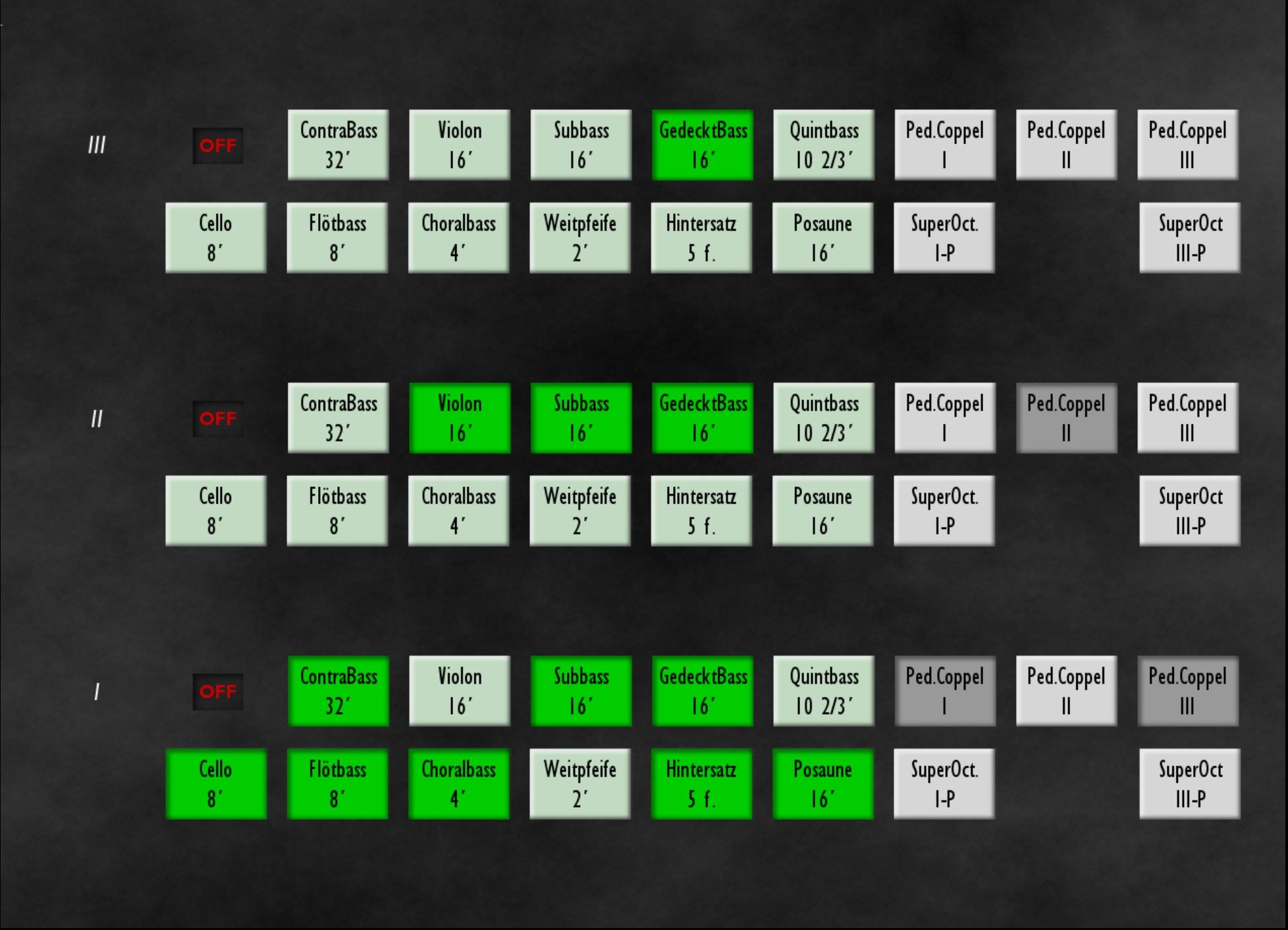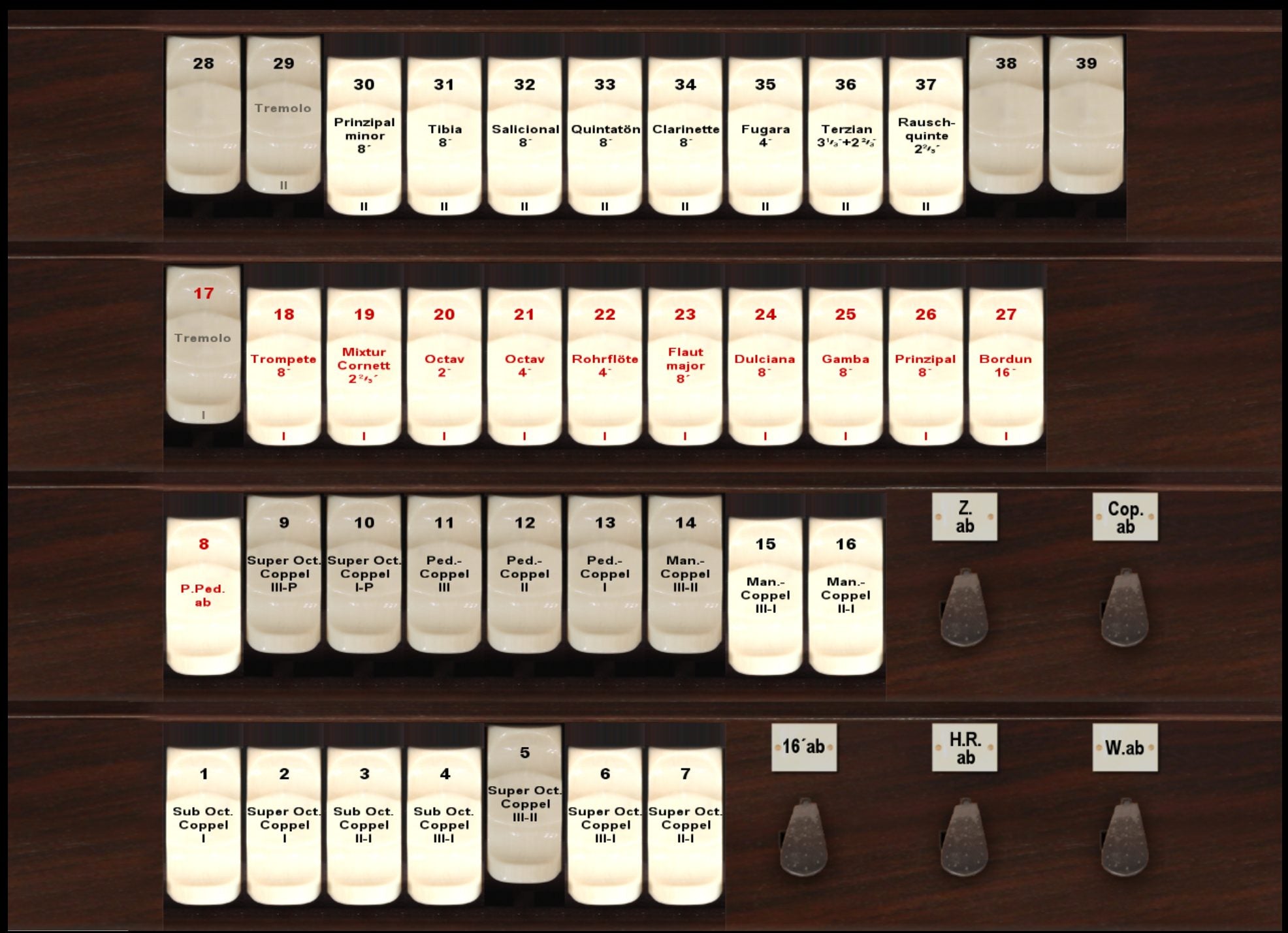 À l'origine, cependant, l'ensemble de l'orgue était enfermé dans une grande boîte de crescendo, avec une façade muette devant elle. Nous avons choisi de modéliser ce comportement pour notre modèle Hauptwerk. La pédale de crescendo fonctionne sur l'ensemble de l'instrument, y compris les jeux de pédale, exactement comme Anton Feith l'a conçu. Alternativement, un interrupteur dédié permet de faire agir la pédale de crescendo uniquement sur le 2ème et le 3ème clavier, ce qui imite le fonctionnement de l'instrument de nos jours.