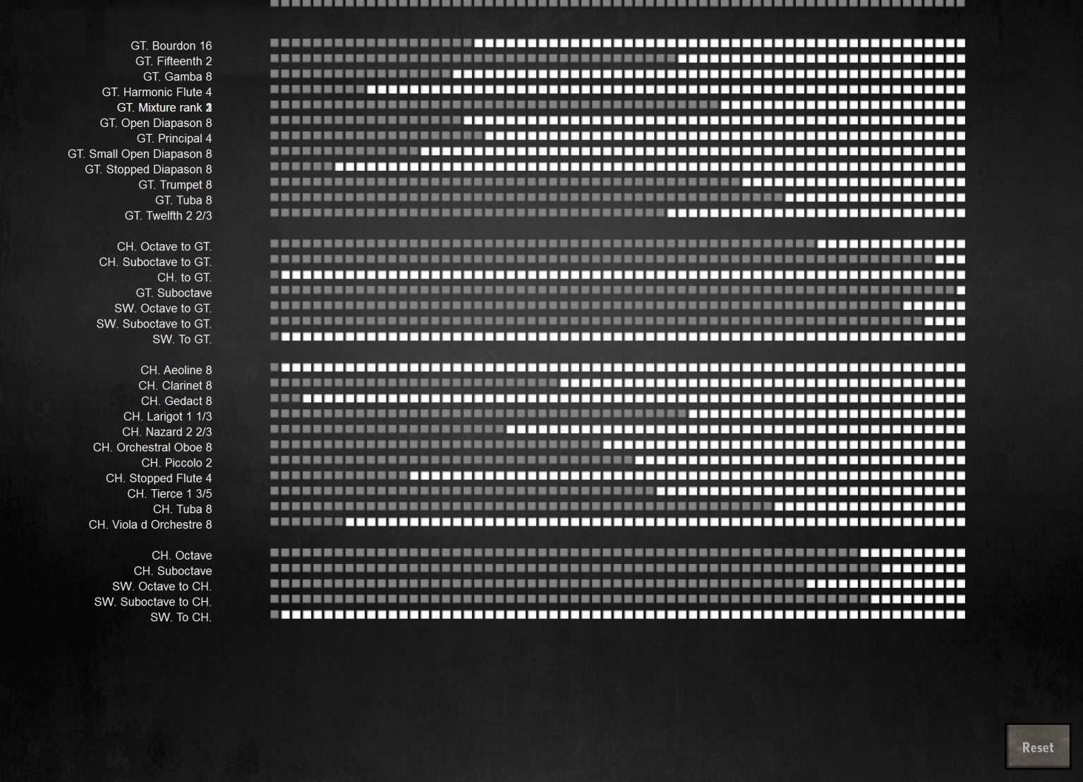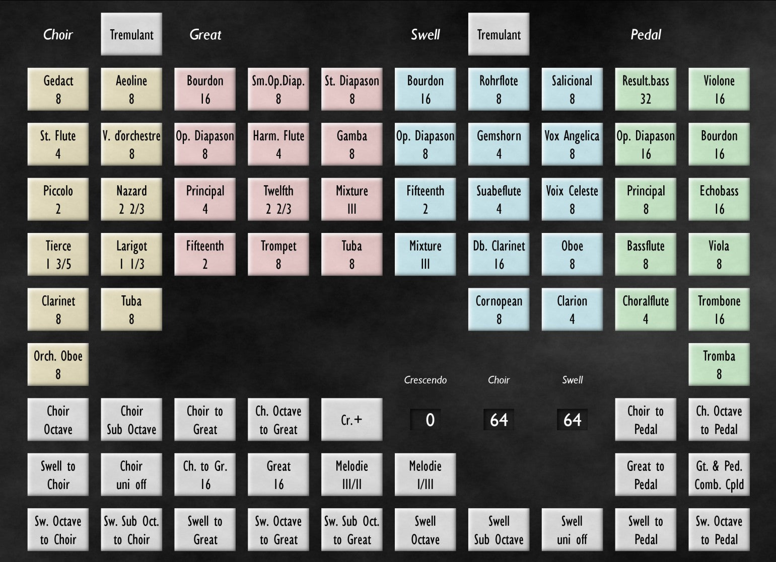Tutti i ranghi sono stati registrati con e senza tremolanti dove disponibili per il comportamento di tremolante più convincente. Tuttavia, il caricamento dei ranghi autentici tremolati consuma una grande quantità di RAM. È possibile selezionare di utilizzare il tremolante artificiale invece per risparmiare RAM (l'interruttore si trova nella scheda mixer).