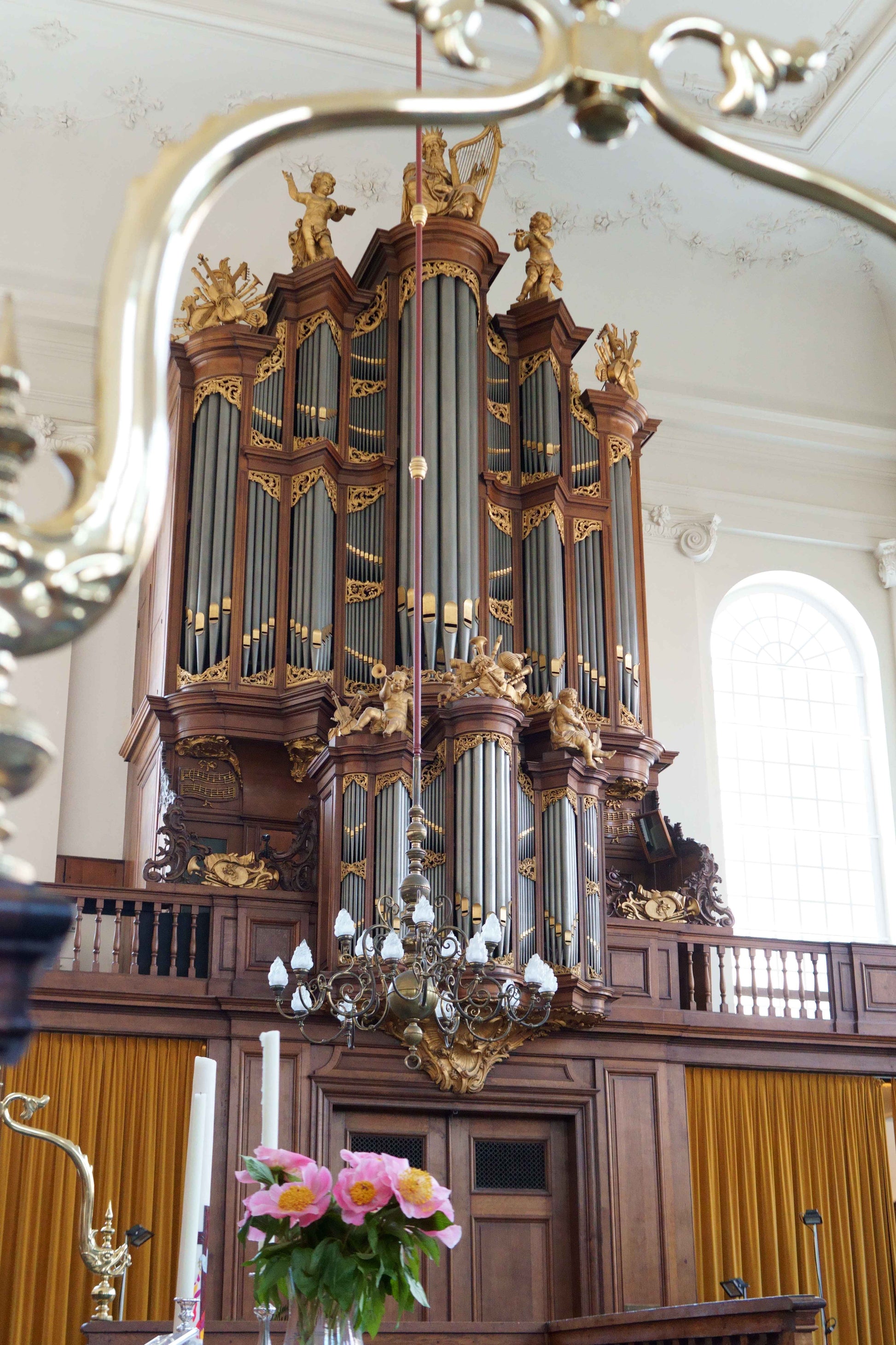 The history of the organ in the Evangelical Lutheran Church in The Hague begins with an organ built by Johannes Wolfgang Schonat in 1648. This instrument was expanded by Appolonius Bosch in 1668. On July 23, 1723, Rudolf Garrels began moving the organ from the north to the south side of the church. He also enlarged the instrument and modified the organ case designed by Daniël Marot. This work was finished on September 4, 1724. The organ now had two manuals and attached pedal, with a total of 14 stops. In 1751 Johann Heinrich Hartmann Bätz was commissioned to build a new organ with two manuals and attached pedal and 23 stops using parts of the existing instrument. The Garrels case was retained. The Bätz organ was completed on September 18, 1753.