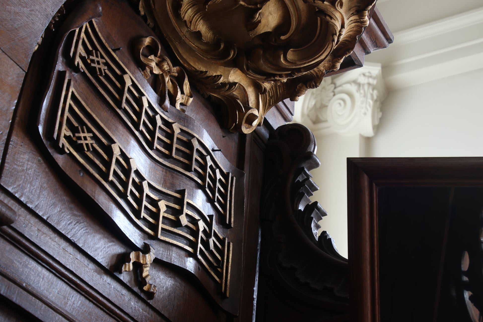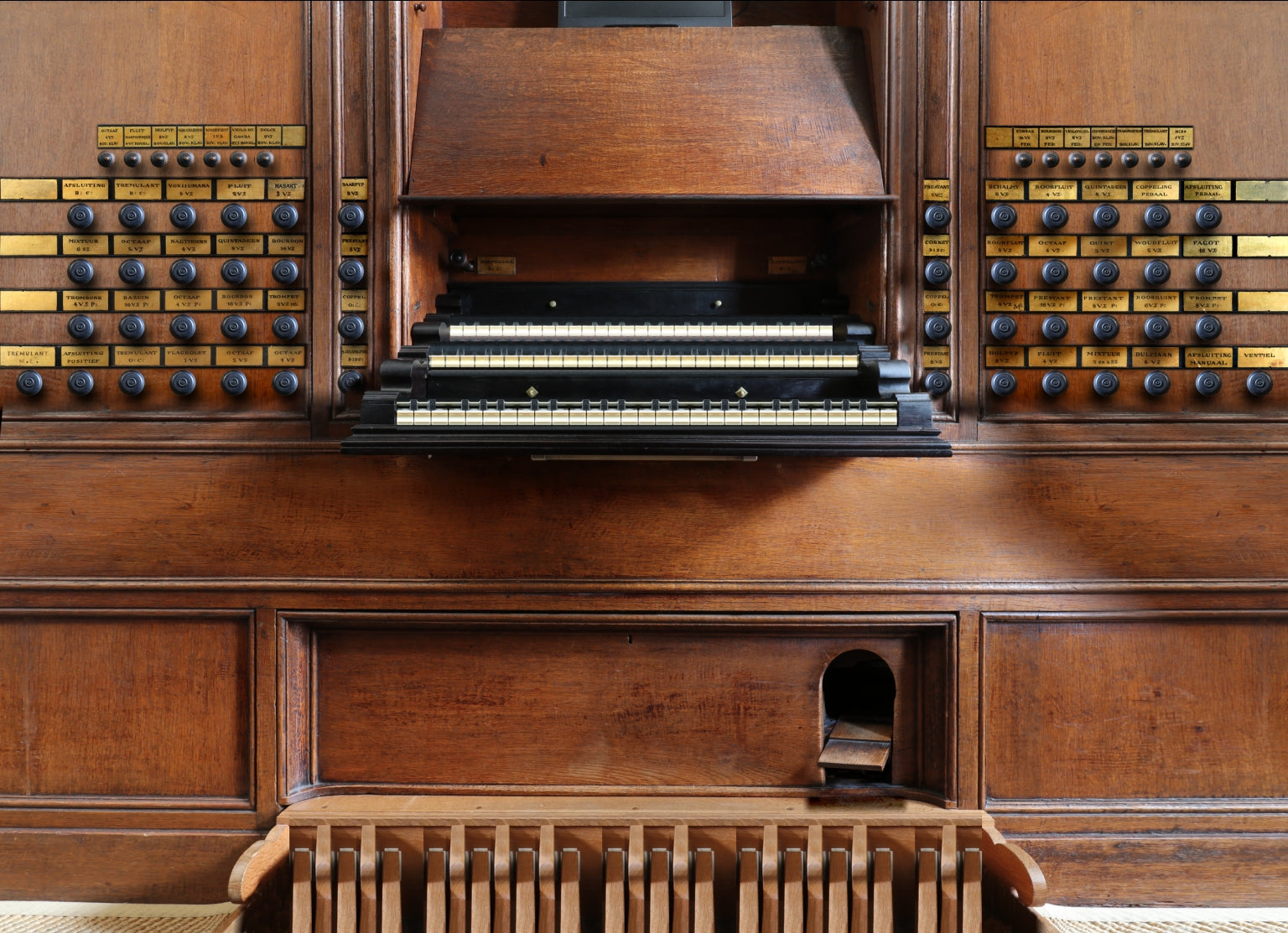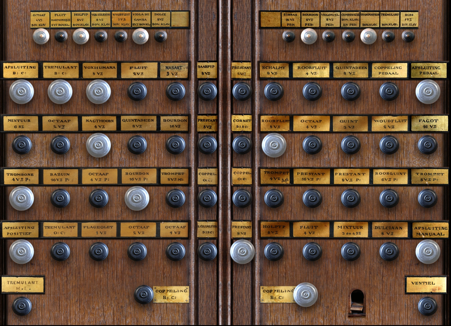 The original compass of the keyboards is 49 keys (C-c4), extendable to 54 keys via a mixer switch in Hauptwerk. The original compass of the pedal division is 25 keys, extendable to 30 keys via a mixer switch. Zwelwerk stops have the original compas of 61 keys (C-c5).