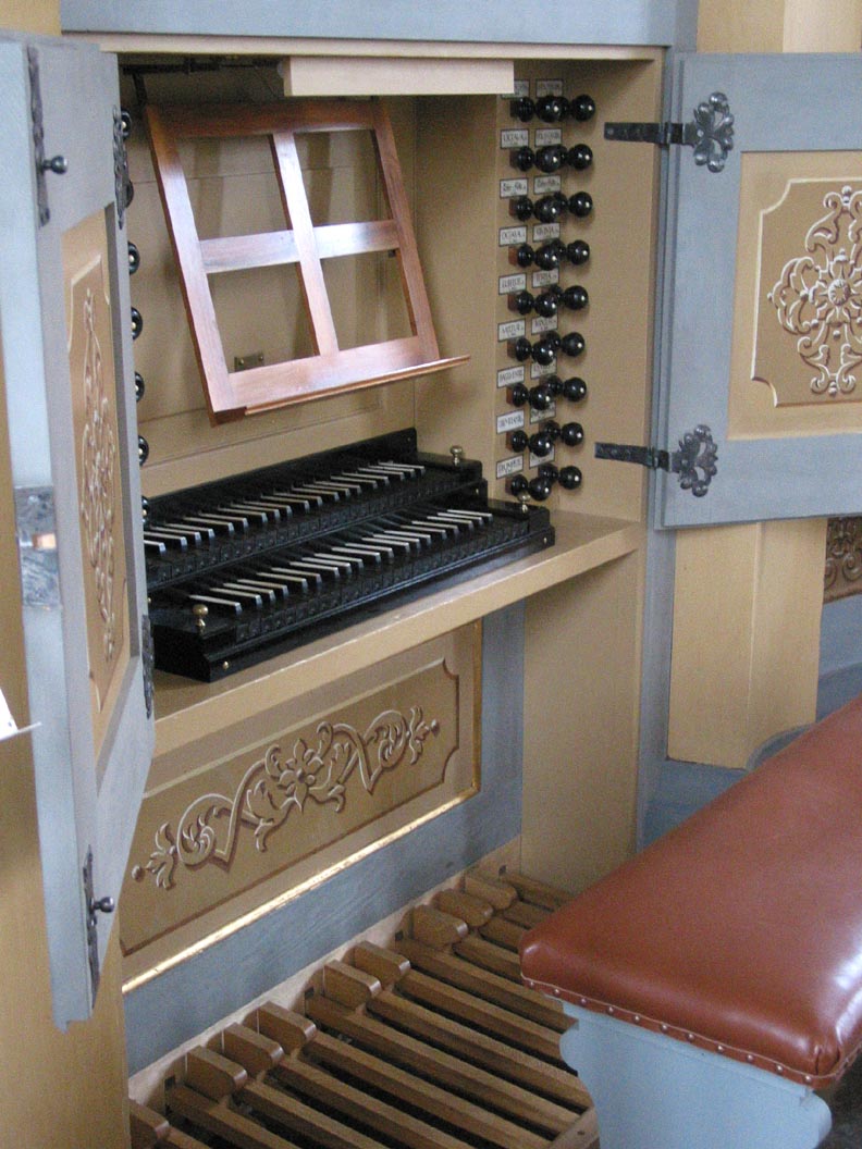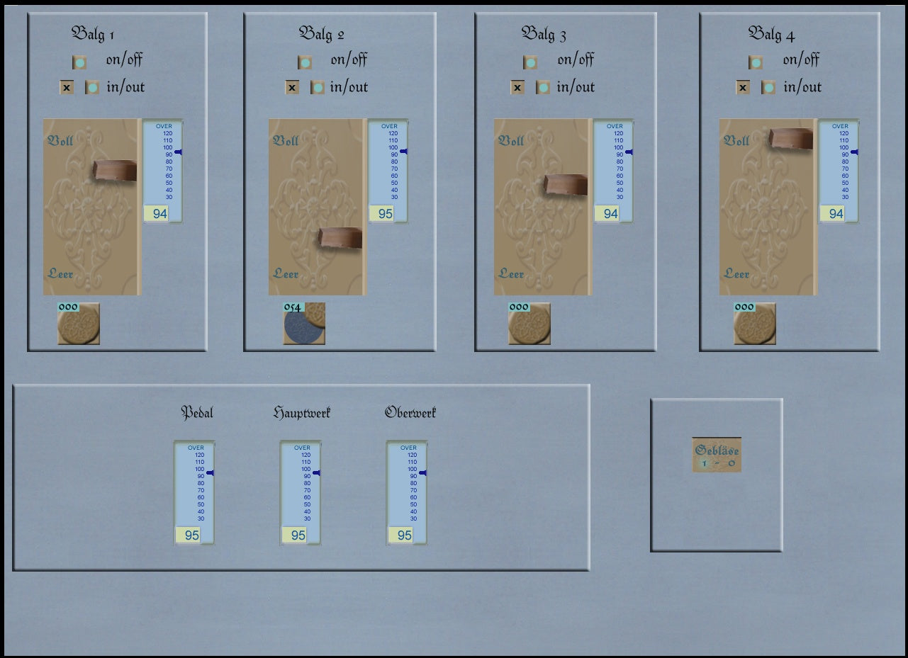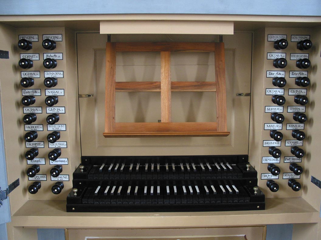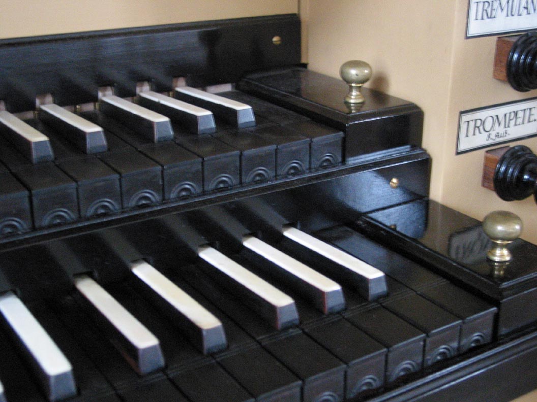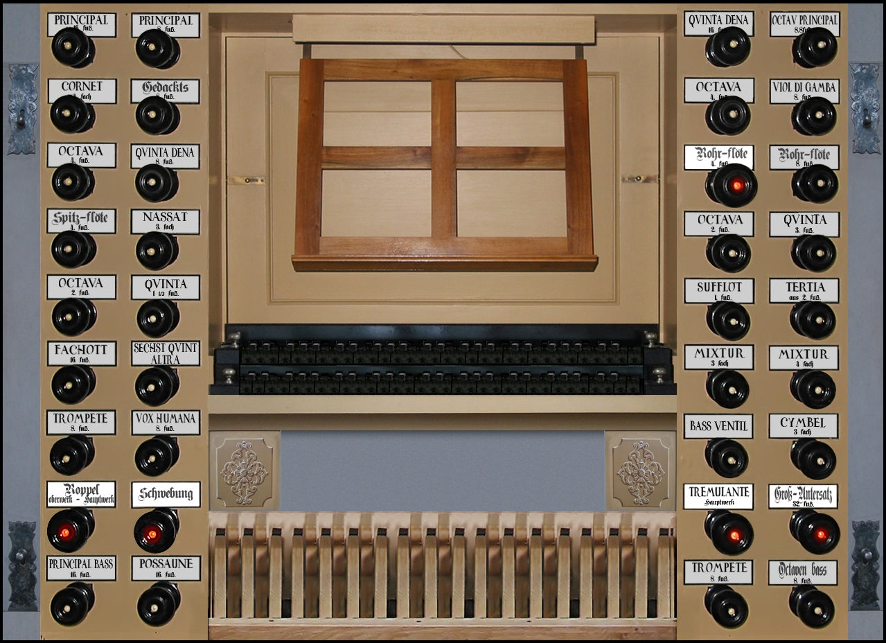 La tastiera originale dei manuali è di 4 ottave senza il C# più basso (questo tono è stato aggiunto virtualmente nel nostro modello). La tastiera originale del pedale è di 2 ottave senza il C# più basso (anch'esso aggiunto virtualmente). Nel modello virtuale, abbiamo esteso la tastiera dei manuali a 4.5 ottave (fino a f) e anche la tastiera del pedale è stata estesa a 2.5 ottave (fino a f). Novità nella versione 2.5: la tastiera estesa funziona anche con il Temperamento Originale dell'Organo.