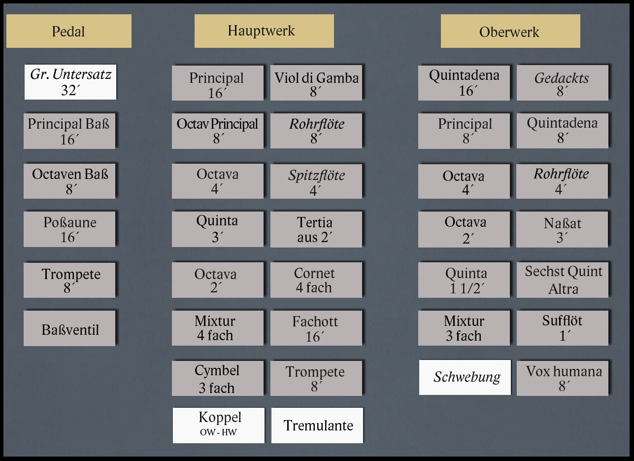 Tuttavia, questo non è il temperamento originale dell'organo quando costruito da G. Silbermann. Secondo le posizioni dei cappelli della Quintadena, il temperamento originale potrebbe essere ricostruito con un alto grado di certezza nel gennaio 2007. È un temperamento modificato meantone.