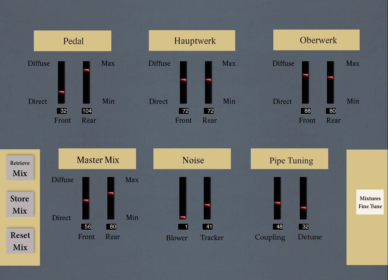 Surround: [novità nella versione 2.5:] la registrazione surround utilizza 6 canali indipendenti per ogni tubo virtuale (per ogni campione). Ci sono quattro canali frontali (2x diretto, 2x diffuso mescolabili liberamente utilizzando la console di miscelazione all'interno di Hauptwerk), due canali posteriori. Sono necessari almeno quattro altoparlanti per riprodurre l'audio surround: due altoparlanti frontali e due altoparlanti posteriori. Tutti e quattro i canali frontali dovrebbero andare ai due altoparlanti frontali, i due canali posteriori dovrebbero essere instradati agli altoparlanti posteriori. Utilizzando i cursori del mixer, l'utente può avvicinarsi o allontanarsi dall'organo. La posizione diffusa del mixer è lontana dallo strumento, la posizione diretta del mixer è vicina all'organo. Le impostazioni del mixer possono essere salvate e recuperate ogni volta che l'organo viene caricato.