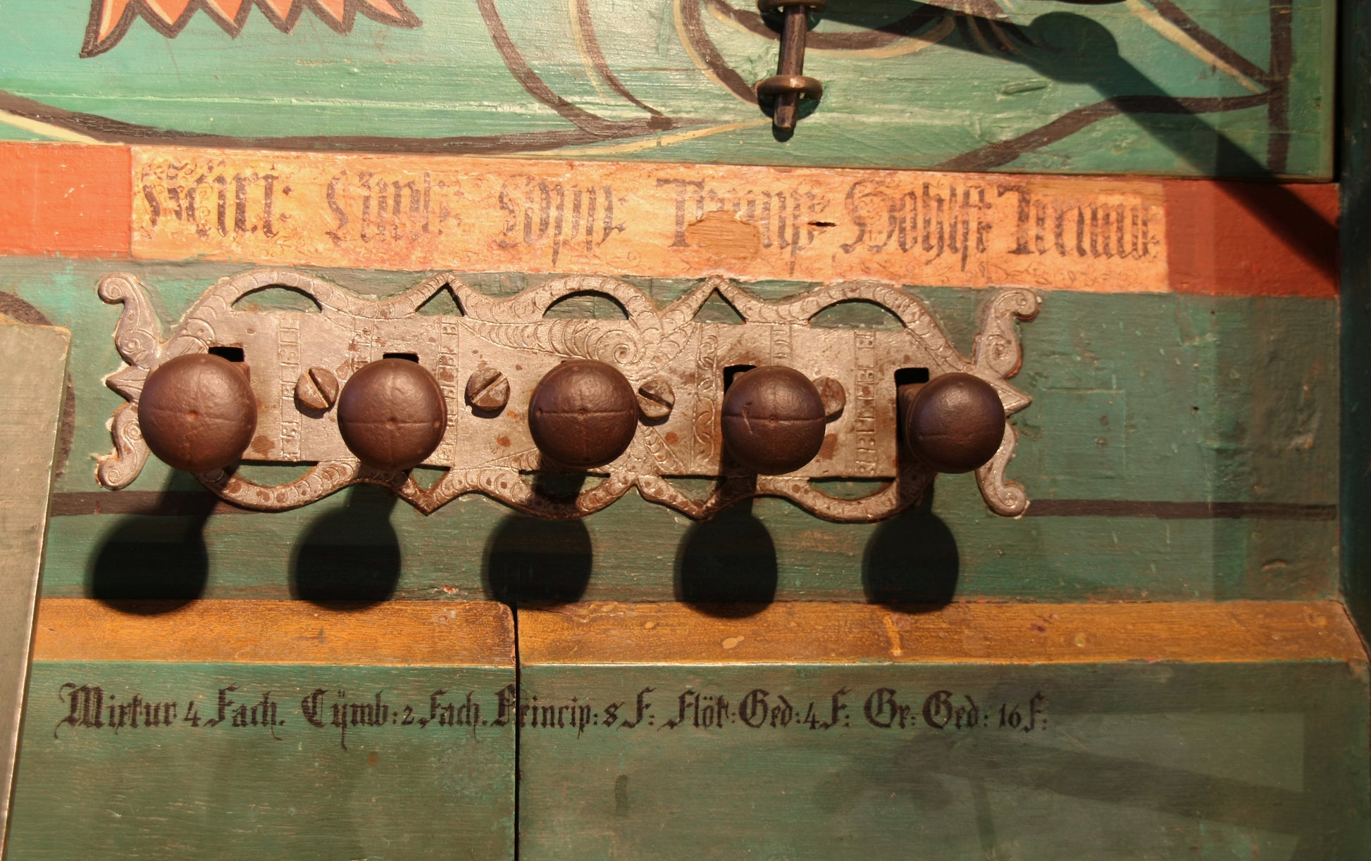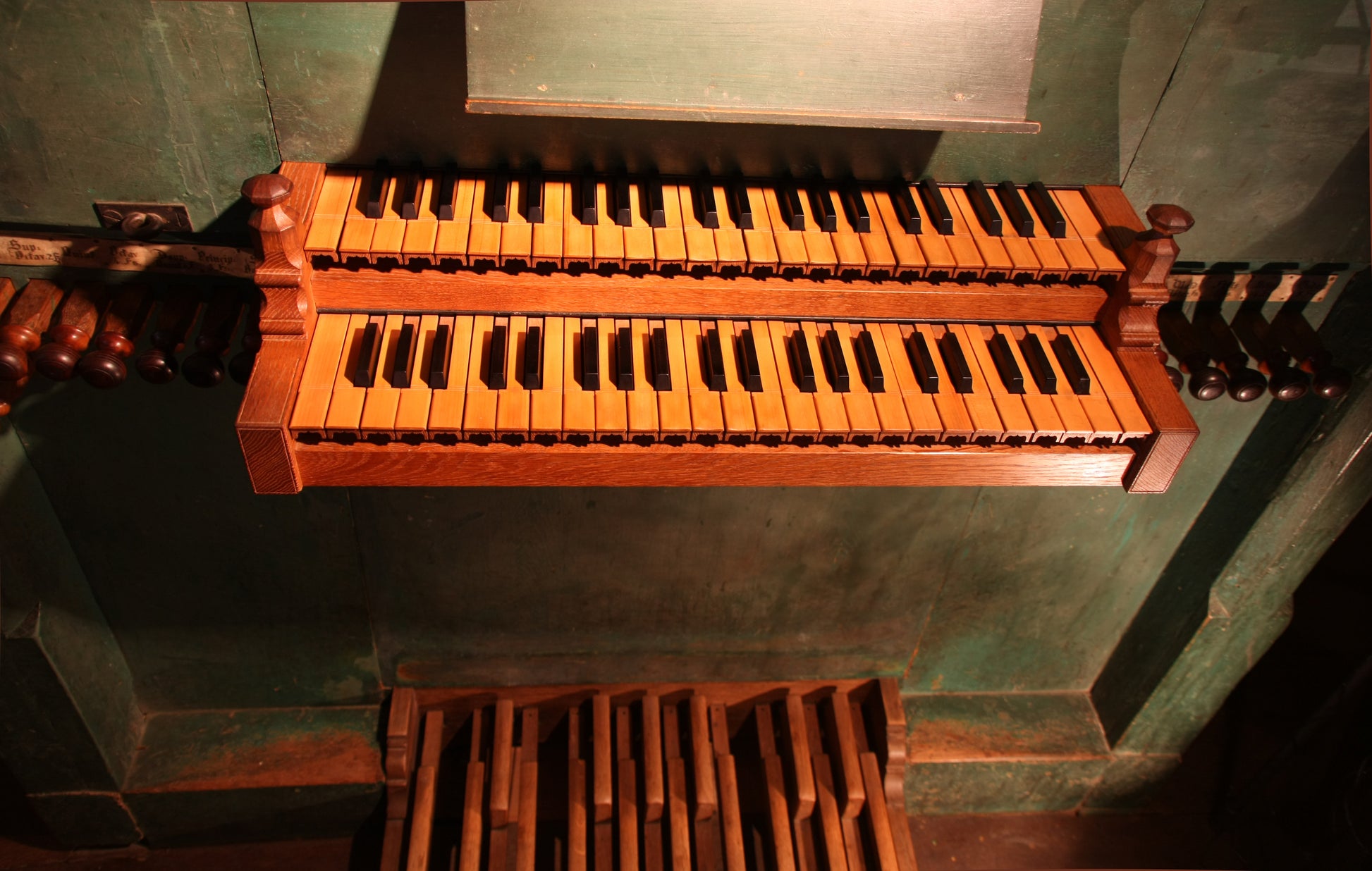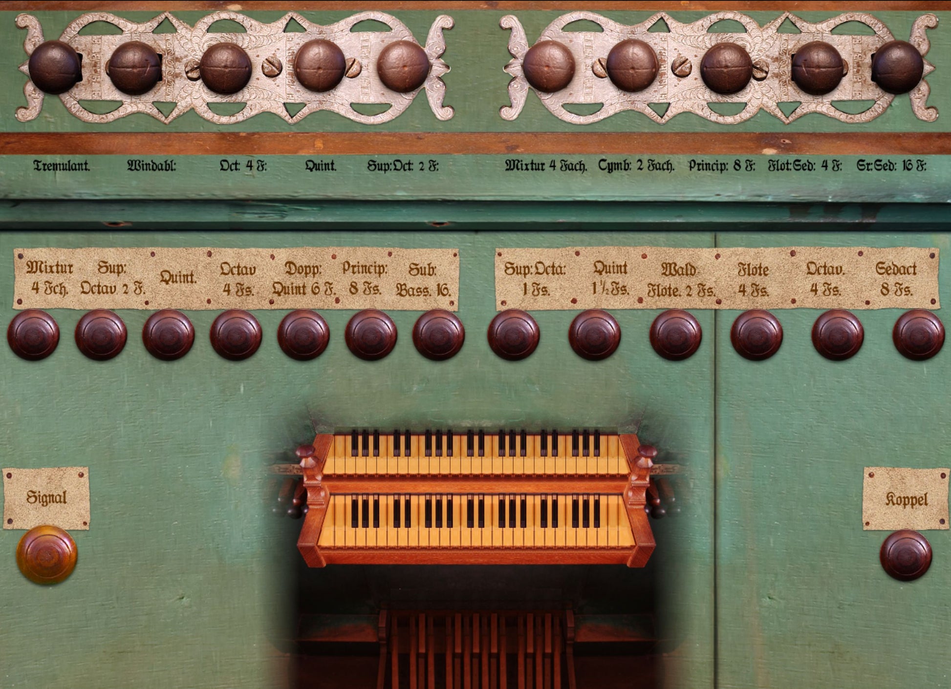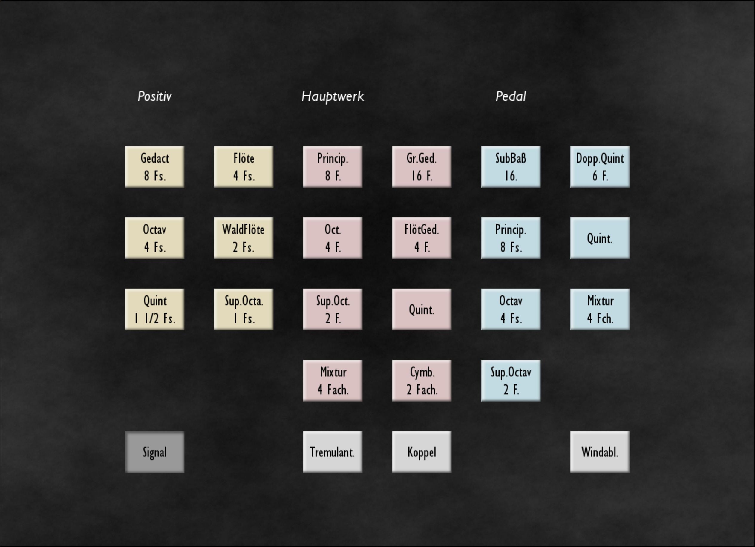 La compass originale delle tastiere è di 45 tasti (C - c3), ottave basse corte. La compass originale della divisione dei pedali è di 17 tasti (C - e0, C# basso mancante).
