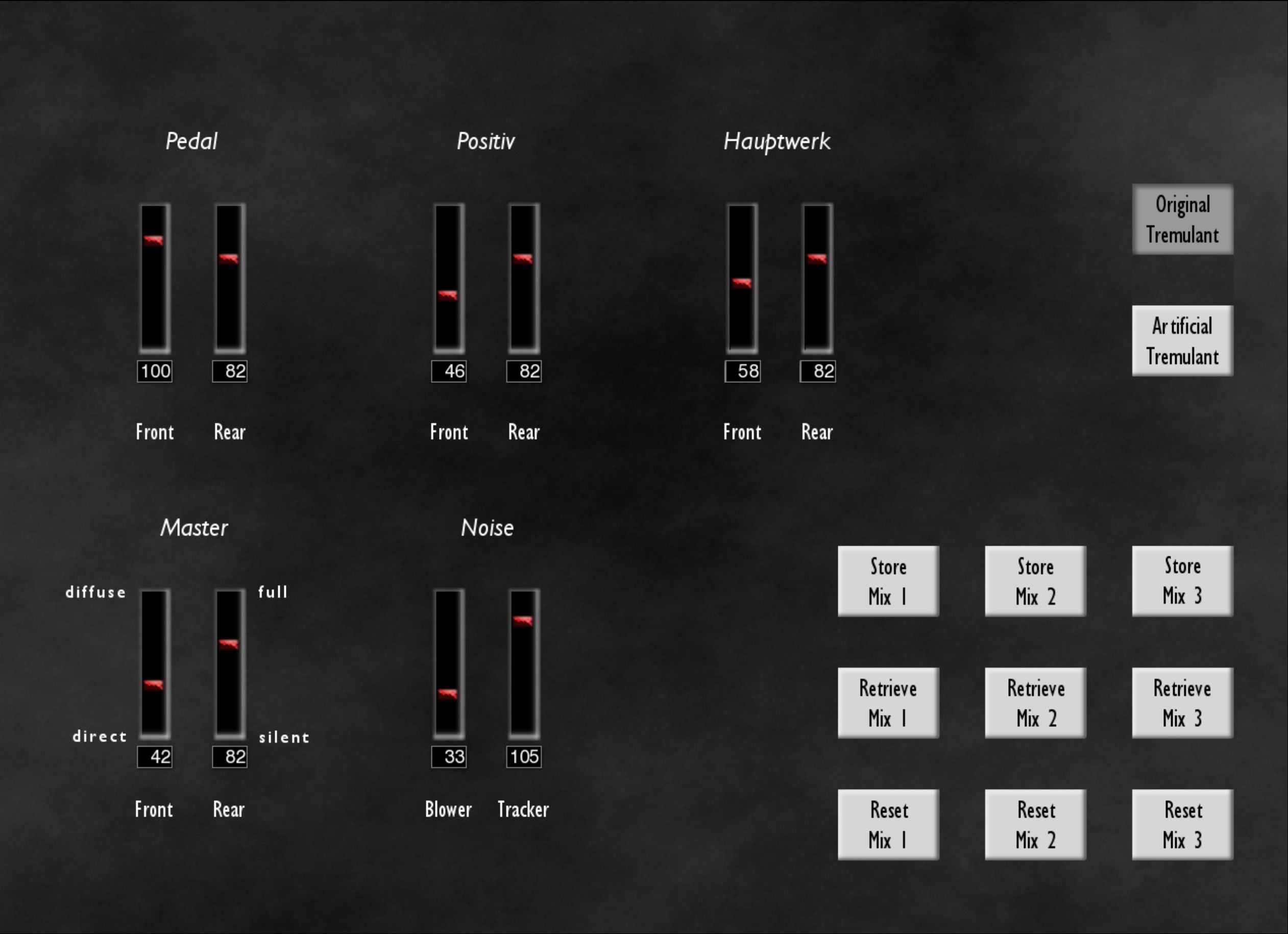 Tutti i ranghi sono stati registrati con e senza tremulanti per il comportamento di tremulante più convincente. Tuttavia, il caricamento dei ranghi tremulati consuma una grande quantità di RAM. È possibile selezionare di utilizzare il tremulante artificiale invece per risparmiare RAM (l'interruttore si trova nella scheda mixer).
