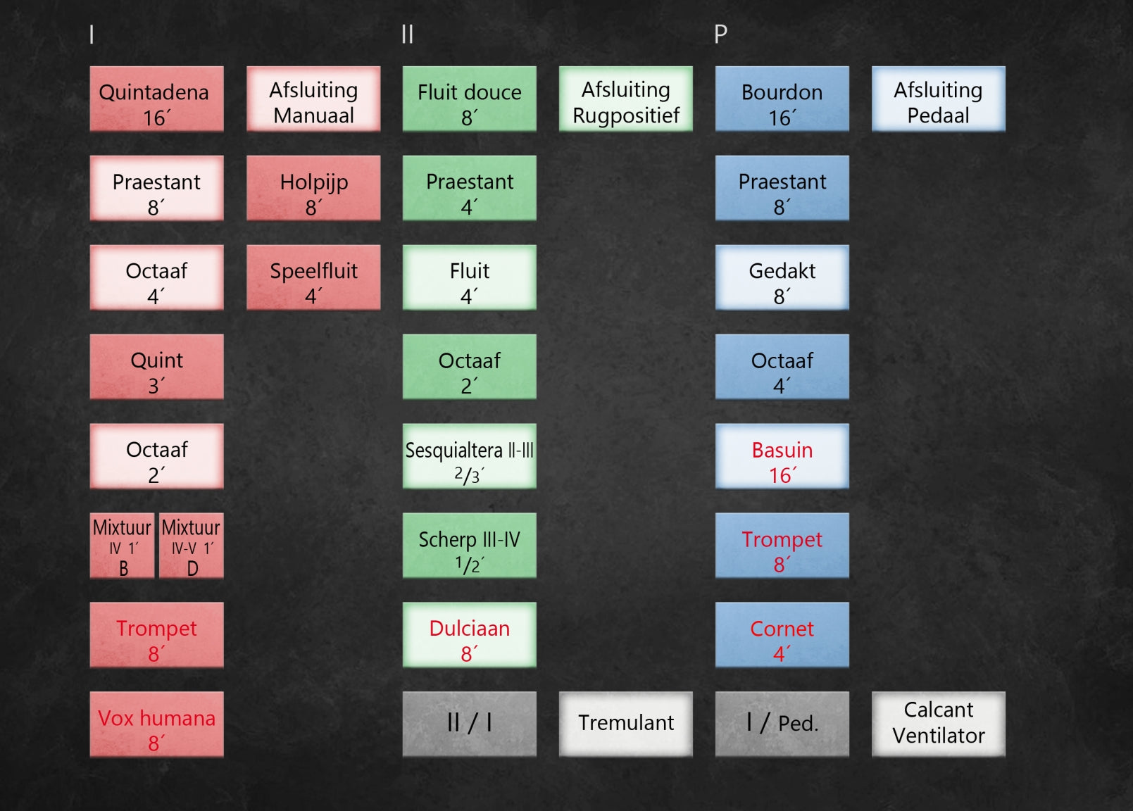 Nel 1855-1856, Petrus van Oeckelen cambiò alcuni registri nel Rugpositief e trasformò la Quintadena in un Burdon 16. Sostituì anche le ance e le canne del Dulciaan 8.