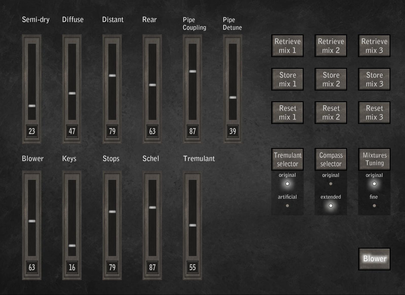 Il set di campioni è offerto nella variante Surround (8 canali). Ci sono canali diretti, che presentano il suono dell'organo immediatamente di fronte al case dell'organo. La prospettiva diffusa ha catturato il suono nella chiesa, più lontano dall'organo. I canali distanti sono stati catturati ancora più lontano dall'organo. Le prospettive posteriori sono progettate per gli altoparlanti posteriori dell'impianto audio. Le prospettive possono essere mescolate liberamente per ottenere qualsiasi posizione di ascolto virtuale, o utilizzate separatamente - a seconda delle preferenze dell'utente. Un "mixer" dedicato è disponibile in Hauptwerk per mescolare il suono al livello desiderato.
