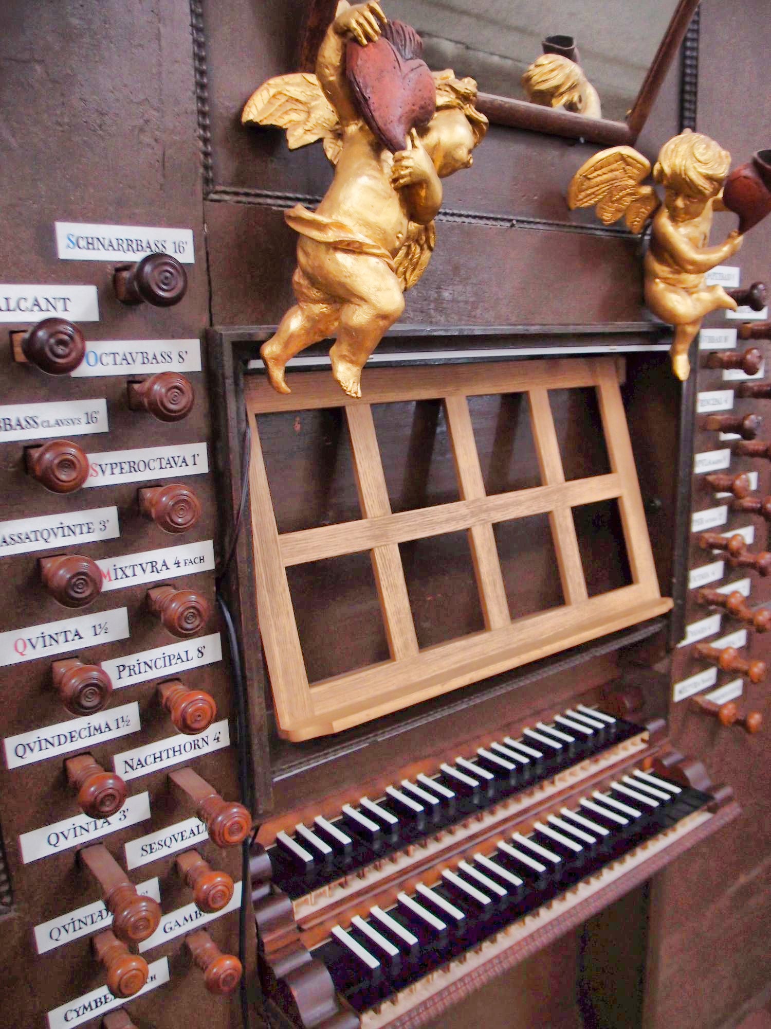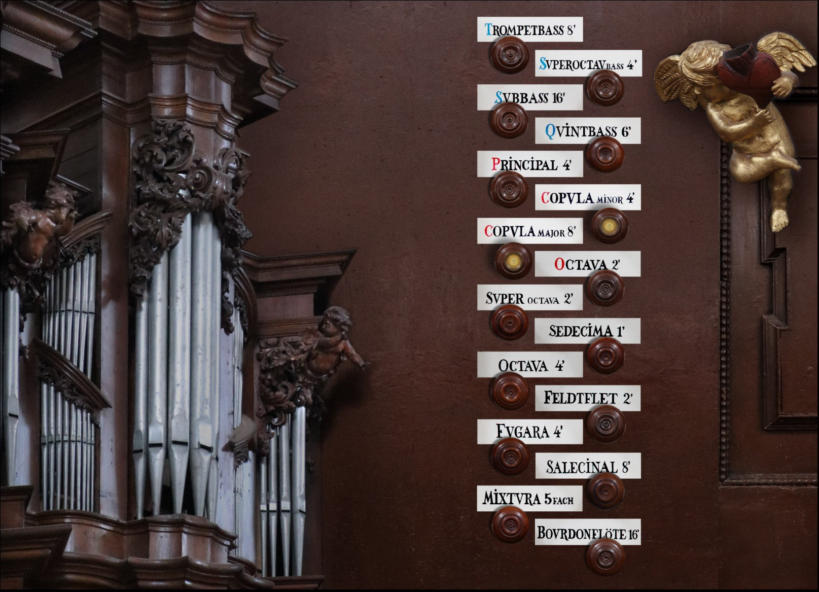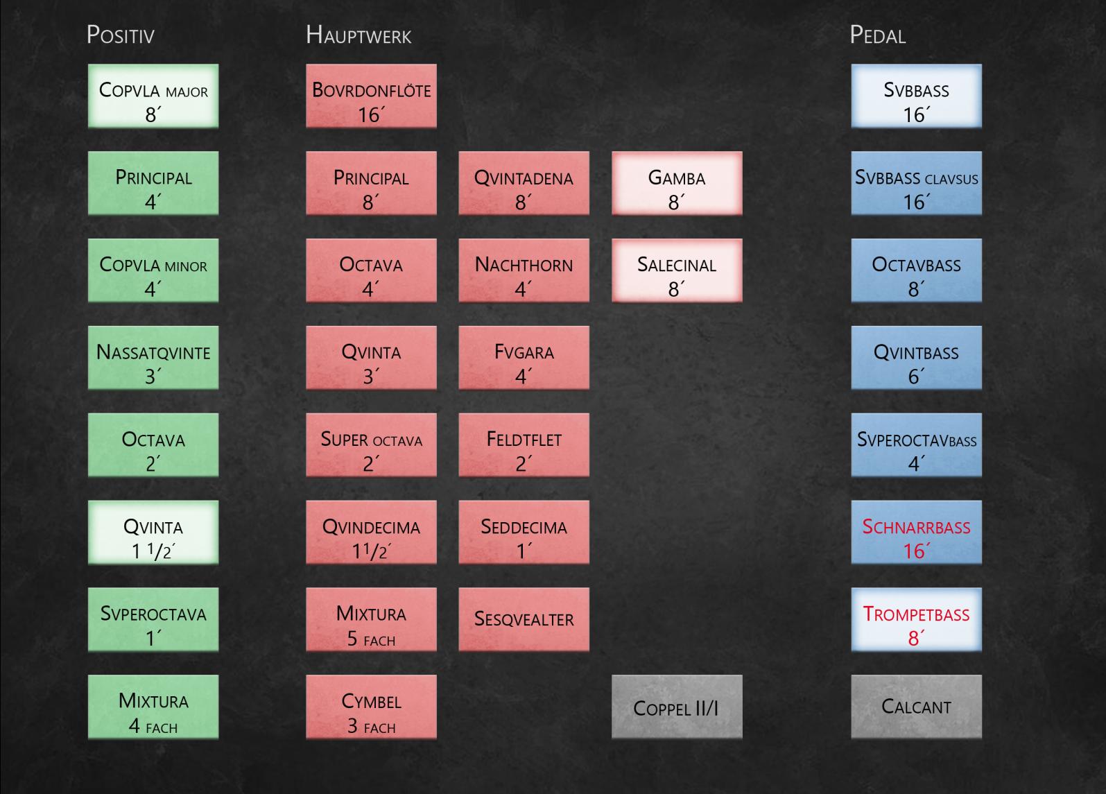 C,D,E,F,G,A-c3 (ottava corta) in tutte le divisioni, esteso a un'ottava di basso completamente cromatica in Hauptwerk. La pedaliera ha 18 tasti, ma solo 12 toni (ottava cromatica più bassa), estesa a 2 ottave in Hauptwerk.