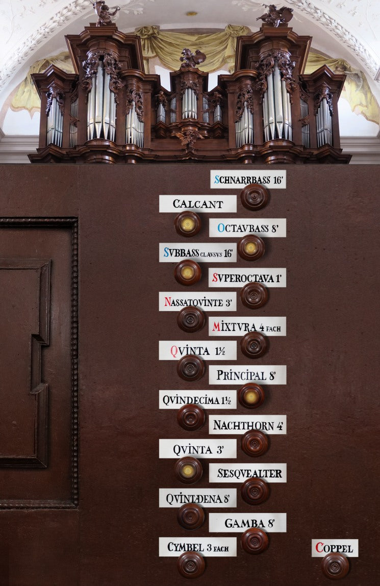 L'organo di Polná è uno strumento a due manuali con 31 registri sonori. Il manuale superiore è il Hauptwerk (Organo Grande) con 16 registri. La caratteristica tipica della divisione è la completa piramide del coro Principale, coronata da una Mixtura acuta e un Cymbel. Ahrend avverte contro l'uso del Cymbel nel plenum, ma so per esperienza che i Cymbels sono spesso usati in un plenum nella musica per organo ceca. Il plenum degli strumenti cechi (sud tedeschi) è completamente diverso nel carattere dai pleni nord tedeschi, e le mutazioni acute giocano un ruolo decisivo nel risultato pungente, feroce e brillante. La divisione Hauptwerk è completata da registri di flauto di intonazione quieta, altamente contrastanti con i principali, e due registri di corda molto morbidi—ancora un elemento molto tipico del design degli organi barocchi cechi. La Gamba ha un suono di un flauto conico, e quindi può essere usata come sostituto di un Gedackt 8', la cui assenza nella specifica è sorprendente. Il manuale inferiore è il Positiv con 8 registri, progettato in modo tipico come il piccolo fratello del Hauptwerk. Ancora una volta, il coro principale è costruito fino alle note più alte, aggiungendo il piano superiore allo spettro sonoro quando accoppiato al Hauptwerk. Il pedale è una divisione progettata per supportare gli ultimi accordi della musica, o fornire un drone per le toccate. Include solo 12 toni cromatici (l'ottava più bassa), sebbene la pedaliera abbia 18 tasti, che è il numero abituale per gli strumenti barocchi cechi. Sebbene i registri a canna fossero estremamente rari sugli strumenti barocchi cechi, il pedale dello strumento di Polná offre due: un Schnarrbass 16' con risonatori in legno e un Trompetbass 8'. Sehnal menziona che c'è un'iscrizione "Hub" sul corpo del Positiv, che potrebbe suggerire un posto per un Hobois a canna, ma per quanto possiamo tracciare la disposizione dell'organo esistente, c'è sempre stata la Superoctava 1' su quel cursore.