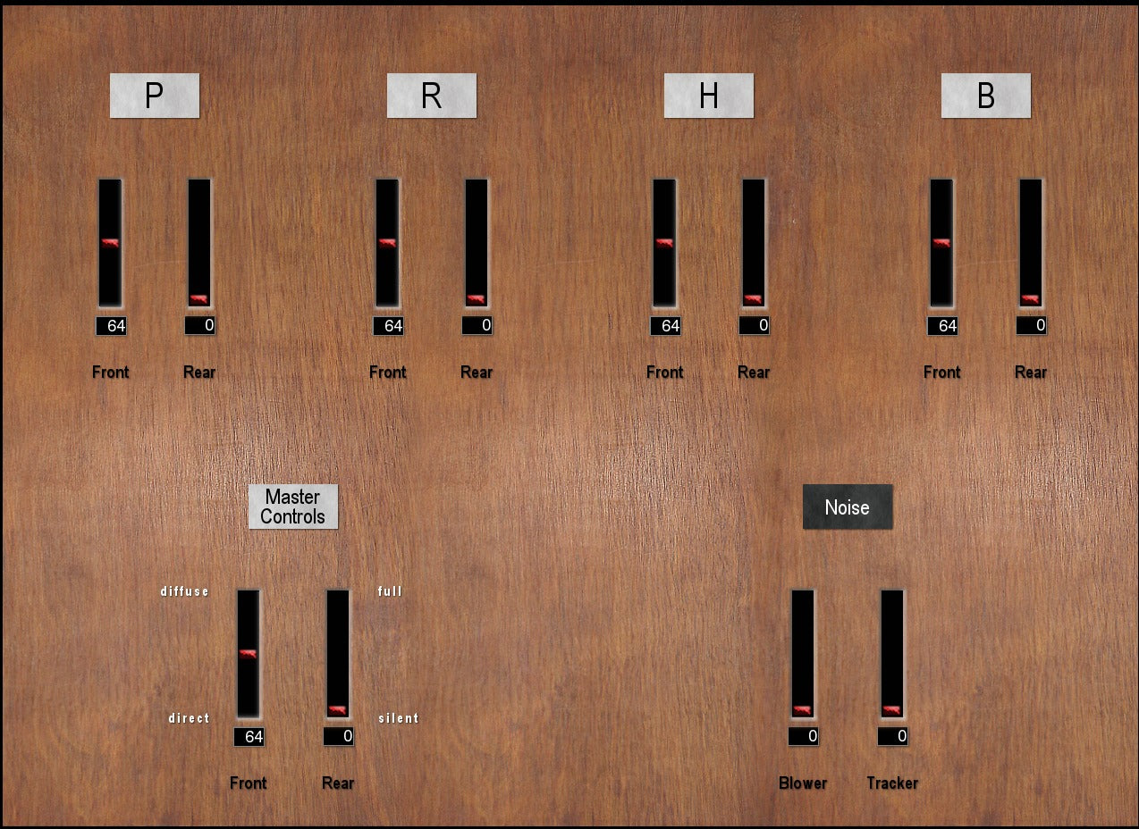 Surround: l'approccio "umido" e "diffuso". I campioni sono registrati in multicanale, offrendo tre posizioni dell'ascoltatore - vicino allo strumento ("umido"), a distanza dallo strumento ("diffuso") e molto lontano dallo strumento ("posteriore"), consentendo di spostare virtualmente la posizione di ascolto in Hauptwerk (per avvicinarsi o allontanarsi dallo strumento). Vedi sotto per i dettagli. Questa variante del set di campioni non utilizza i campioni della variante wet.