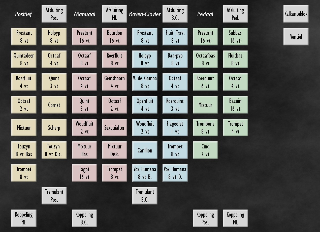 Rw: Quintadeen 8', Octaaf 4', Quint 3', Octaaf 2', Mixtuur e Scherp = per lo più dal 1571,
