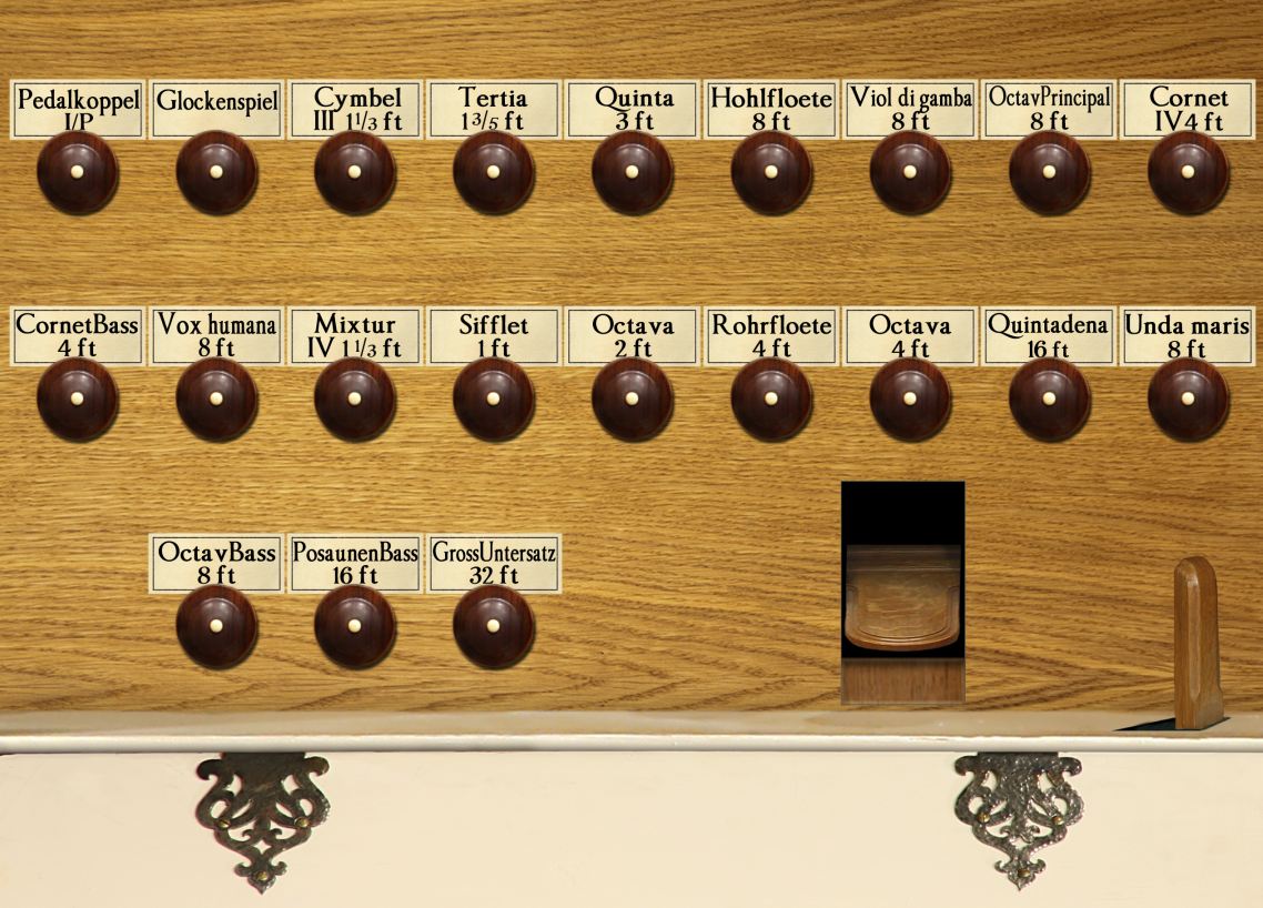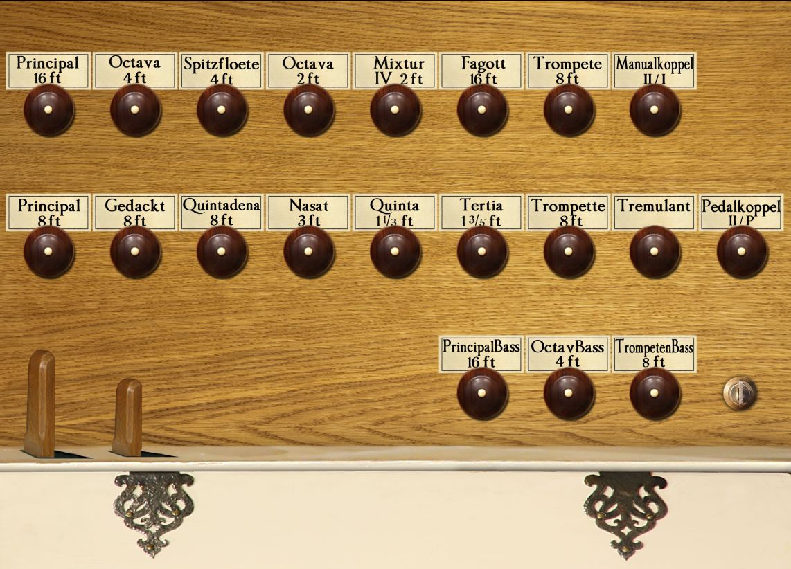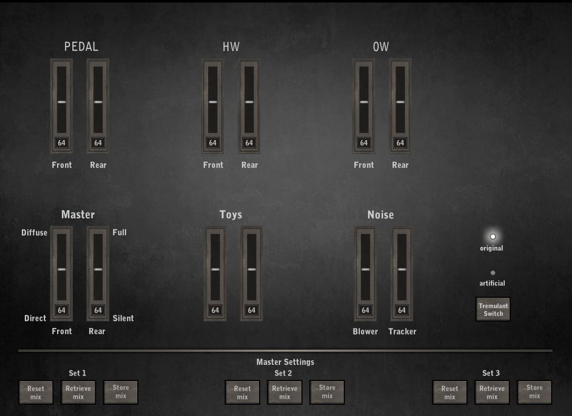 Tutti i ranghi sono stati registrati con e senza tremulanti per il comportamento di tremulante più convincente. I tre registri di pedale più bassi non hanno tremulante. Caricare i ranghi tremolati autentici consuma una grande quantità di RAM. È possibile selezionare di utilizzare il tremulante artificiale invece per risparmiare RAM (l'interruttore si trova nella scheda mixer).