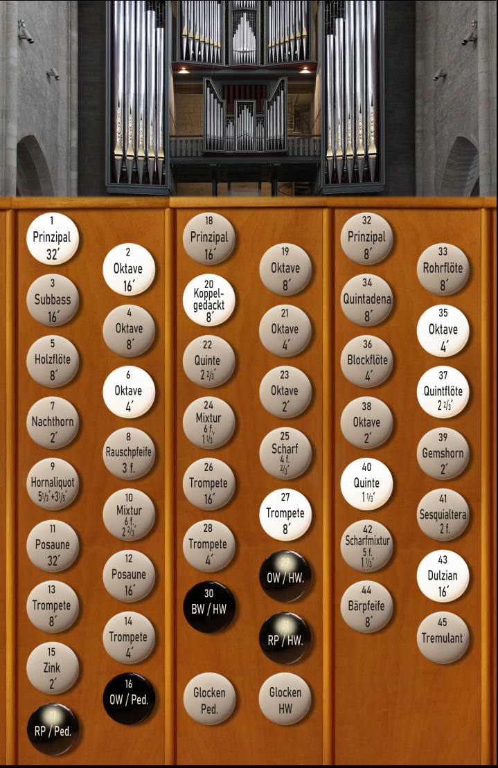 The original compass of the keyboards is 56 keys, extendable to 58 keys via a mixer switch. The original compass of the pedal division is 30 keys, extendable to 32 keys via a mixer switch.
