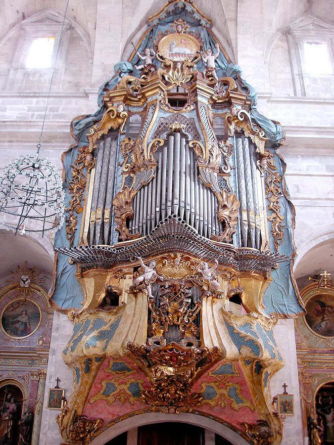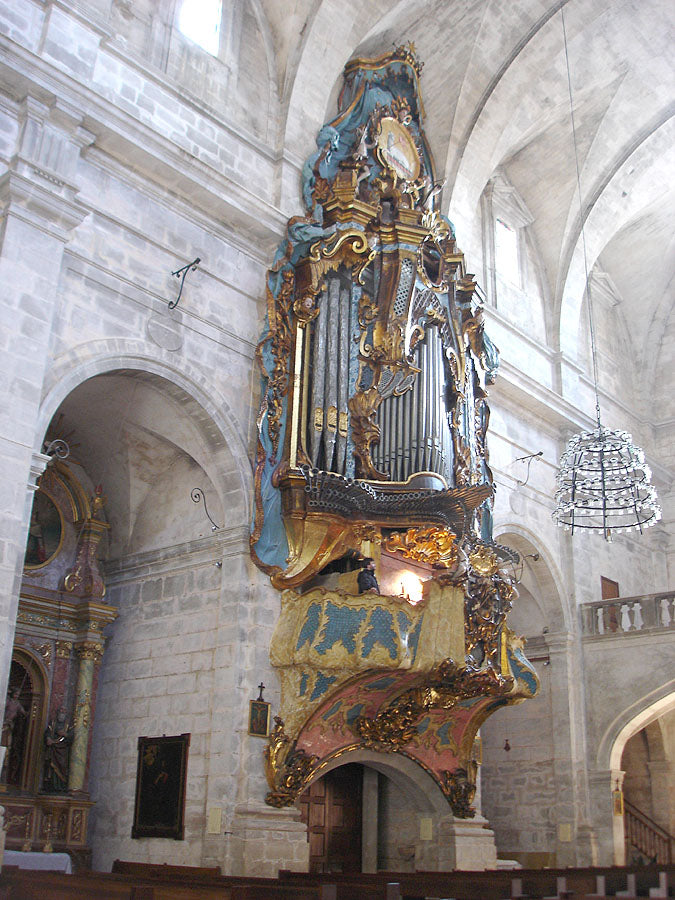 The two manual organ with 40 divided ranks of Jordi Bosch is a real gem among the Mallorcan organs. Its monumental and splendidly decorated facade (by Fra Albert Borguny) resembles the imperial pomposity of the time and adds to the brilliant sound of its stops.