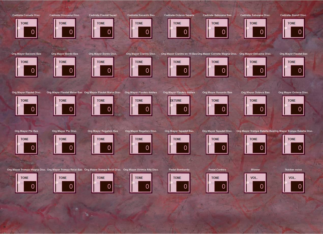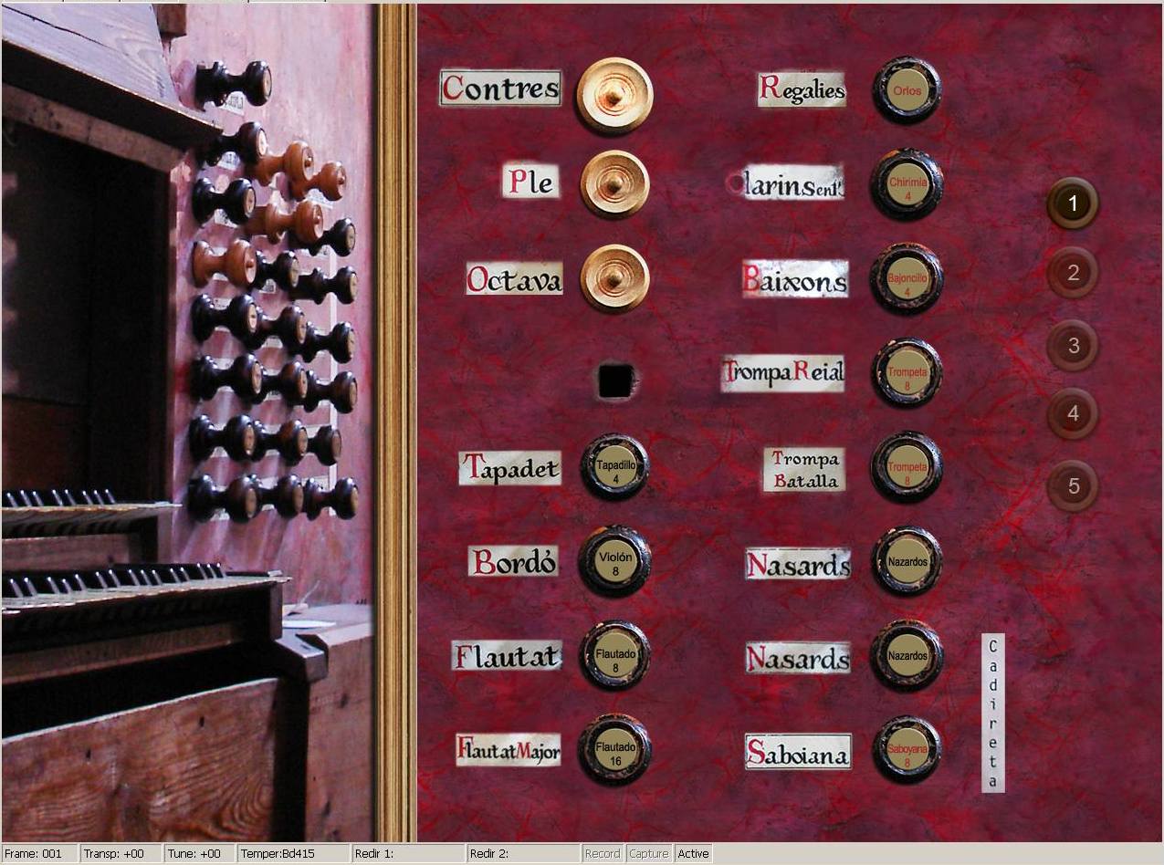 Requires 1280x1024 px screen resolution. Single console, as well as dual stop jambs are available. The stops are positioned exactly as on the original console (including the various style drawknobs). However, the Pedal Contres drawstop was added for the ease of use of the Organ Model; originally this stop is always on without having a visible drawstop.