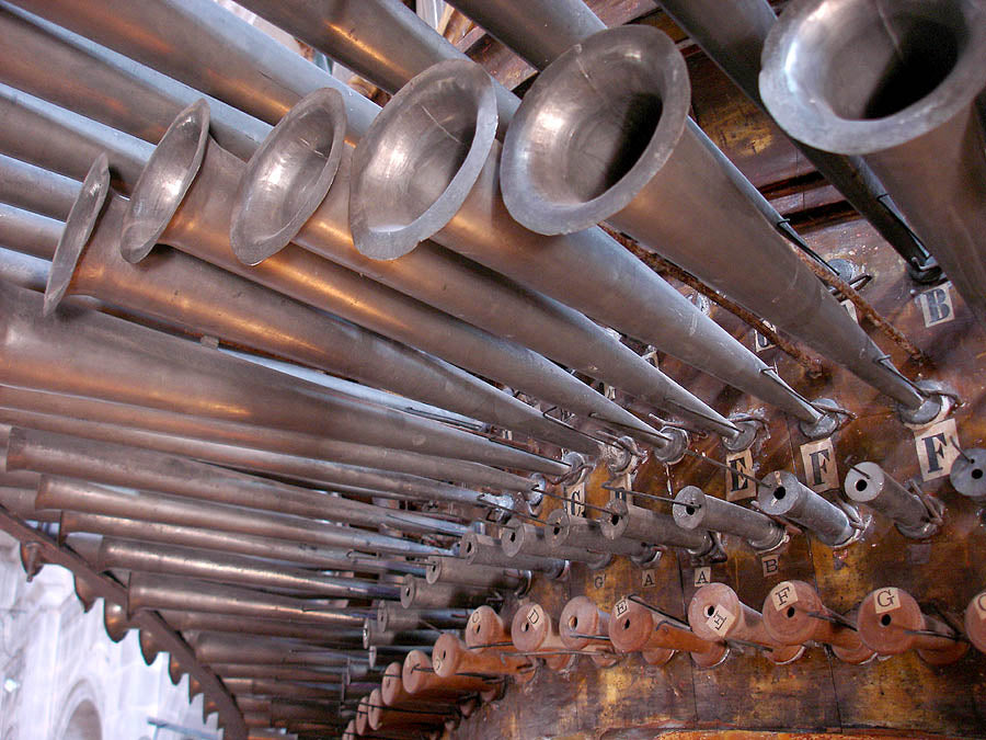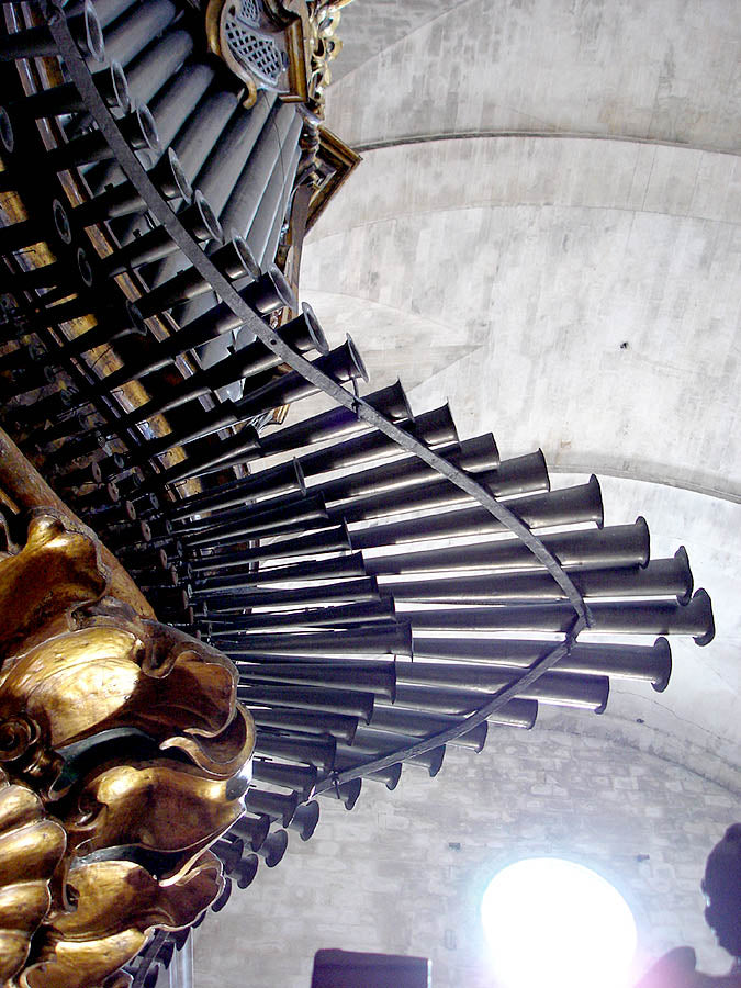 The organ of Santanyi is one of the best preserved works of Jordi Bosch. It has a rich "Trompeteria" composed of 9 ranks of horizontal trumpets, so typical for the Iberian organbuilding school. It spreads its sound to every corner of the church thanks to the fan-shaped (radial) spacing of the trumpets. The Grand Orgue is built on a wide 16 feet Principal (Flautat maior) which gives sonorous and warm sound to the pleno. The organ preserves the largest existing mixture (Ple) in the world, composed of 25 ranks and 1.104 pipes! It is built on a separate windchest and each tone is fed by its own 2.5 m long wind conduit.